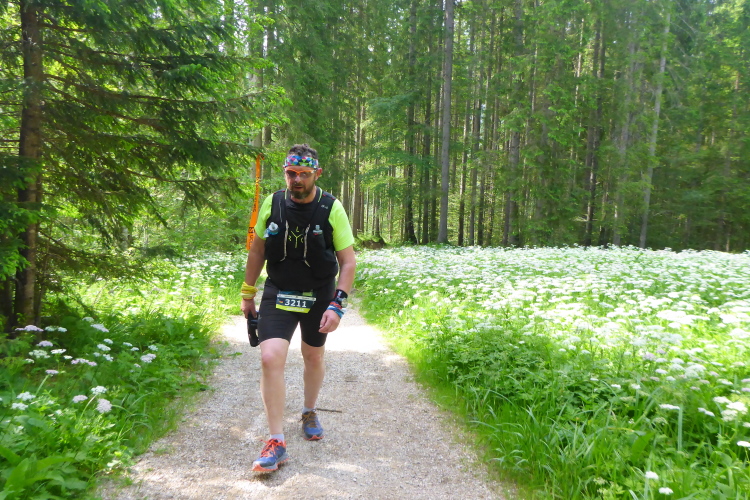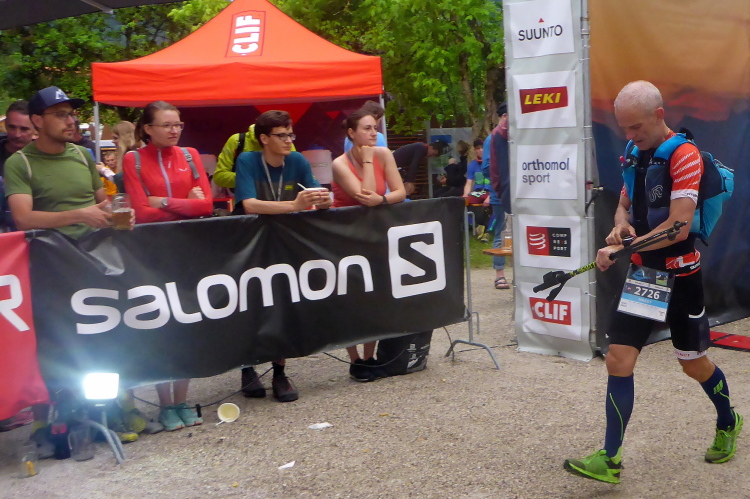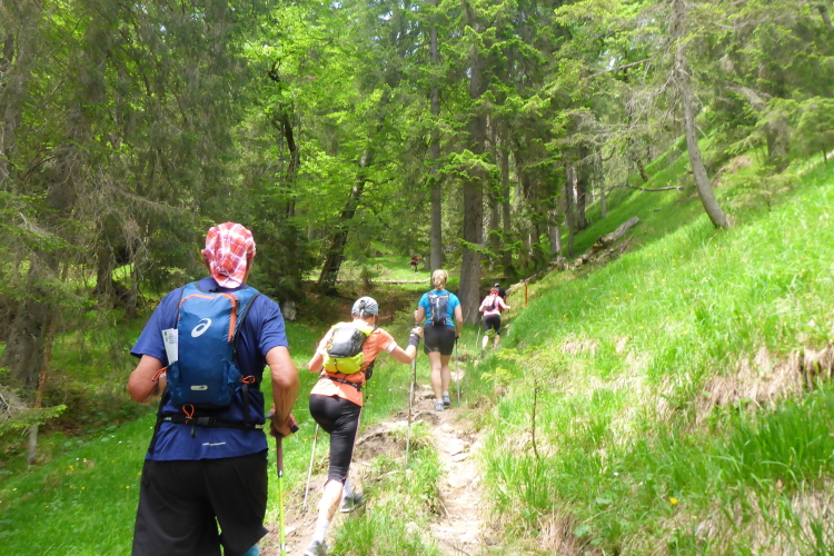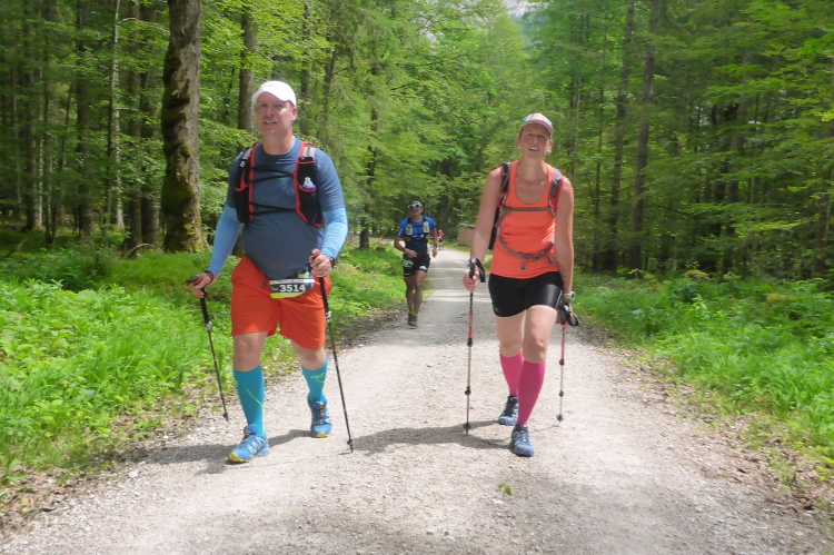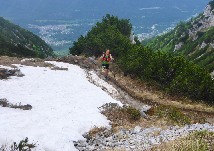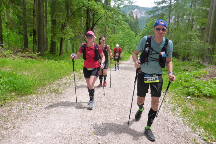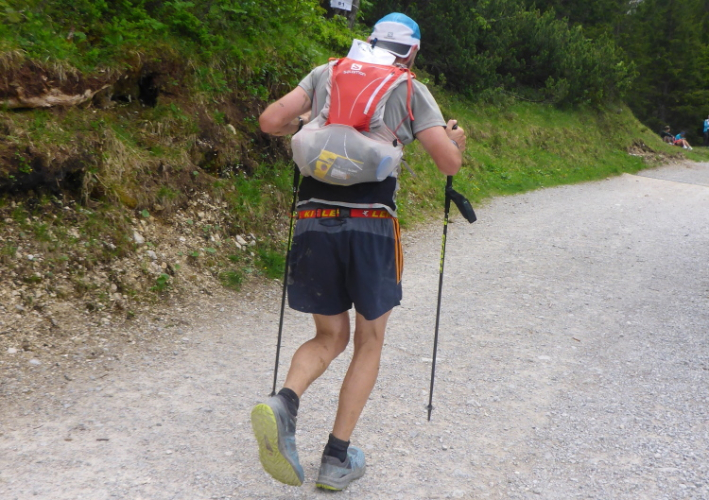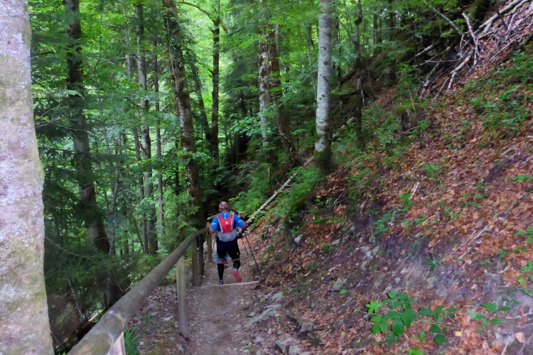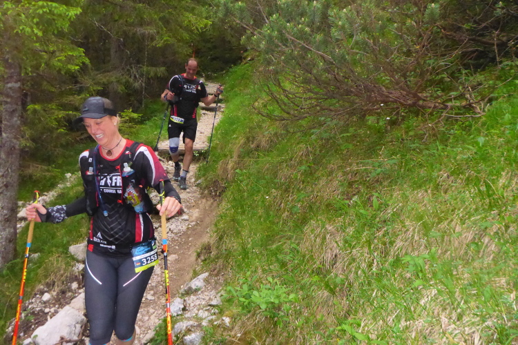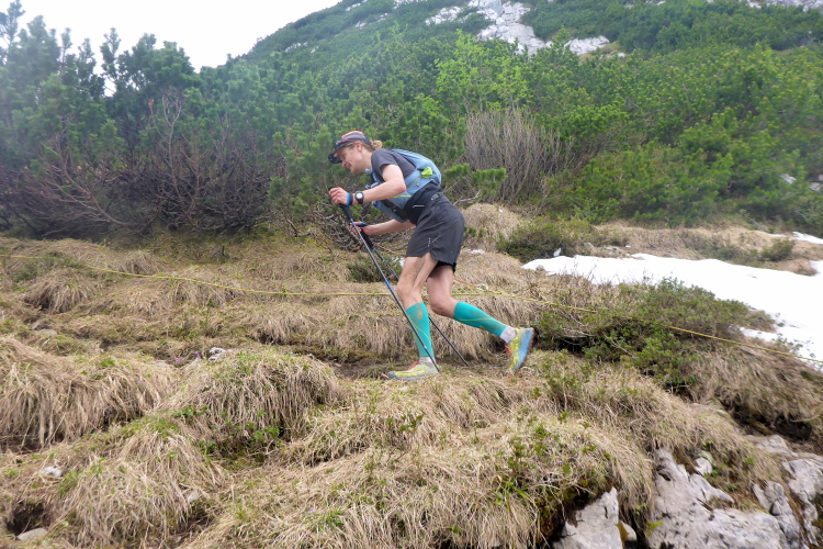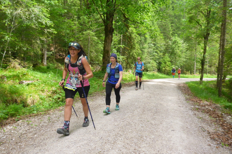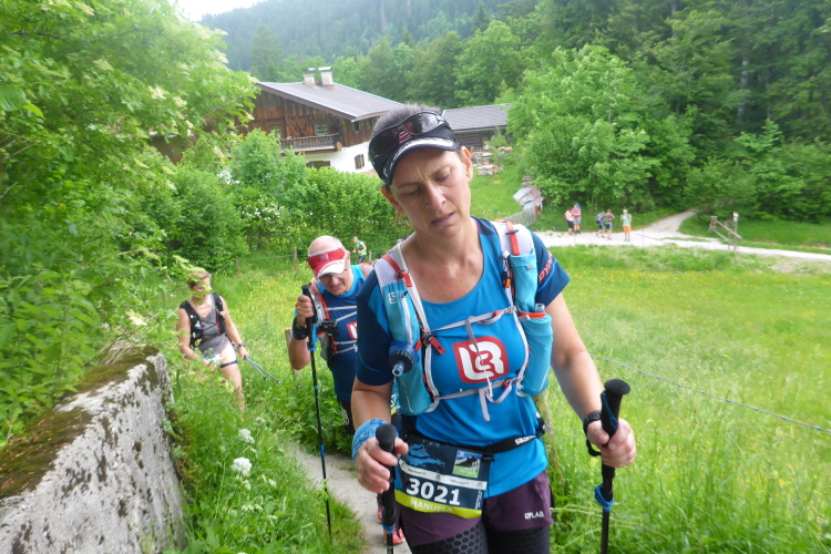 Die ersten Meter muss ich hinunter rutschen, so steil ist es. Im Wald wird es etwas besser. Eine Läuferin benutzt ihre Stöcke als Krücken, denn sie ist am Bein verletzt, die Bergwacht ist schon informiert und auf dem Weg. Bestürzt unterhalte ich mich mit einer anderen Läuferin, die bemerkt hat, wie unsicher ich auf den Beinen bin. Sie bietet mir einen Stock als Hilfe an, aber ich lehne ab. Mir fehlt die Technik, um jetzt ein Experiment zu wagen.