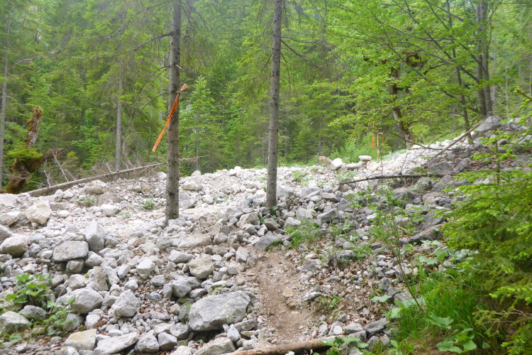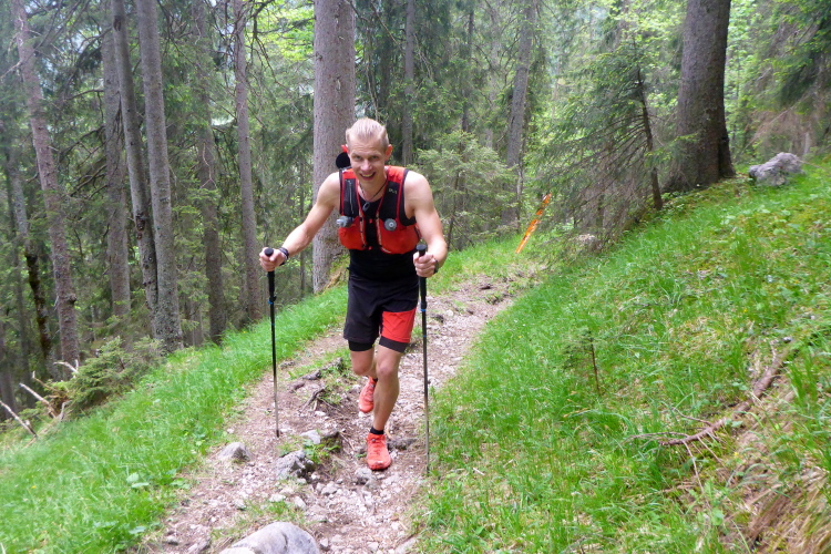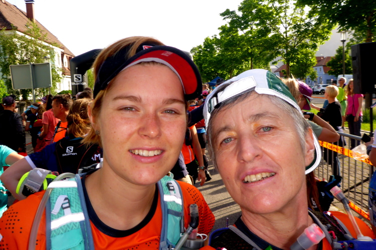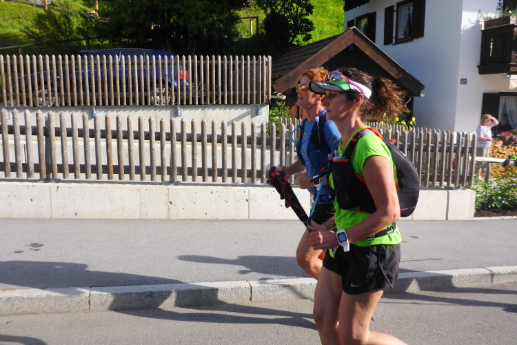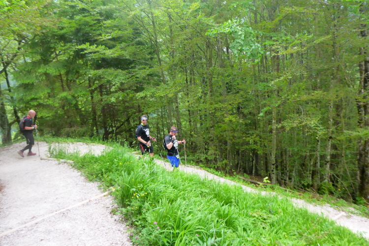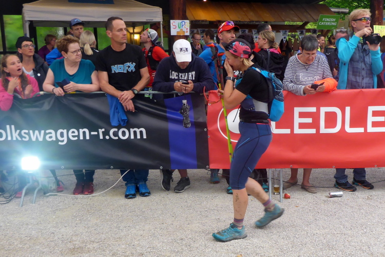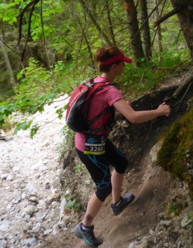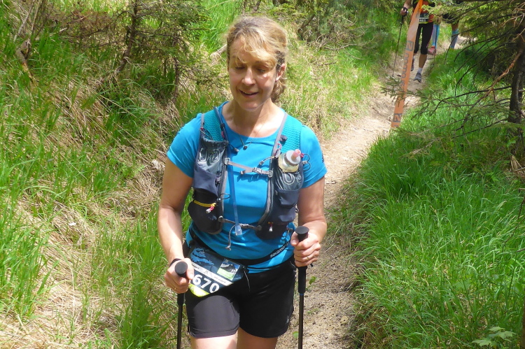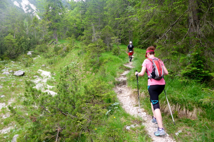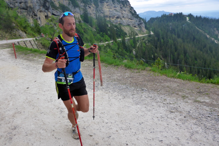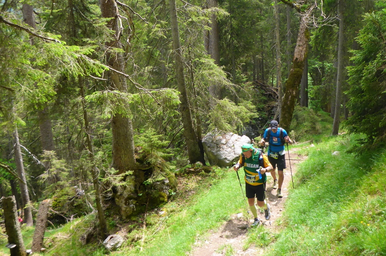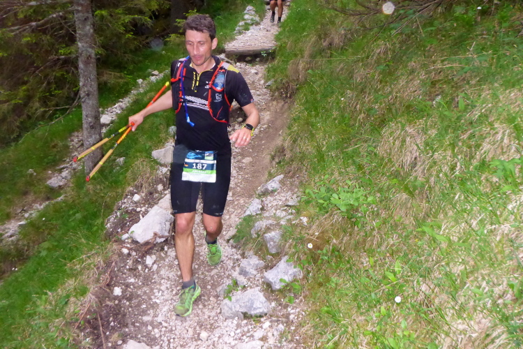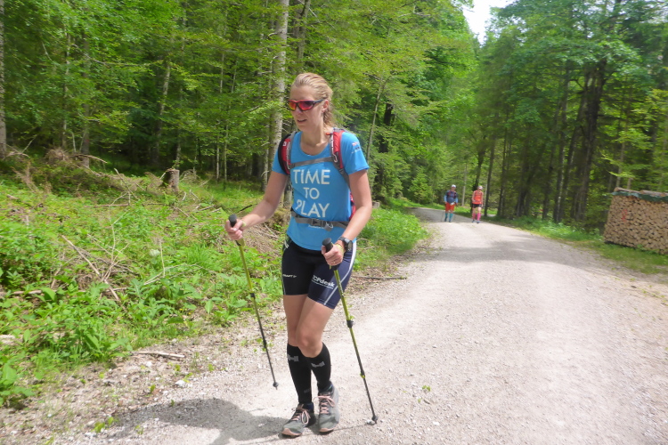 Die ersten Meter muss ich hinunter rutschen, so steil ist es. Im Wald wird es etwas besser. Eine Läuferin benutzt ihre Stöcke als Krücken, denn sie ist am Bein verletzt, die Bergwacht ist schon informiert und auf dem Weg. Bestürzt unterhalte ich mich mit einer anderen Läuferin, die bemerkt hat, wie unsicher ich auf den Beinen bin. Sie bietet mir einen Stock als Hilfe an, aber ich lehne ab. Mir fehlt die Technik, um jetzt ein Experiment zu wagen.