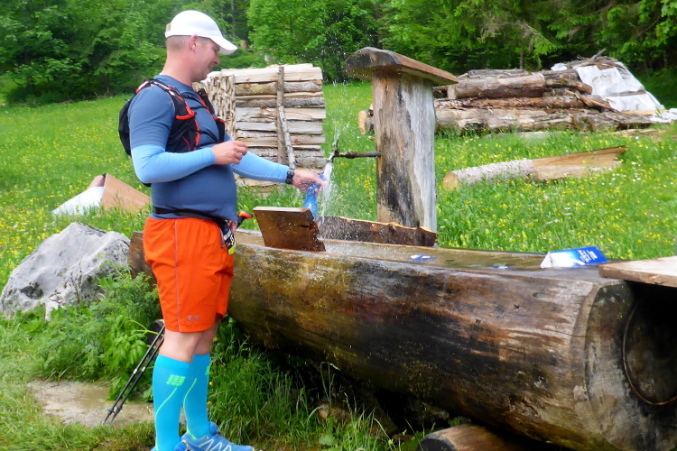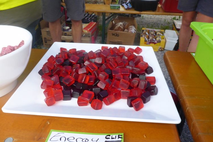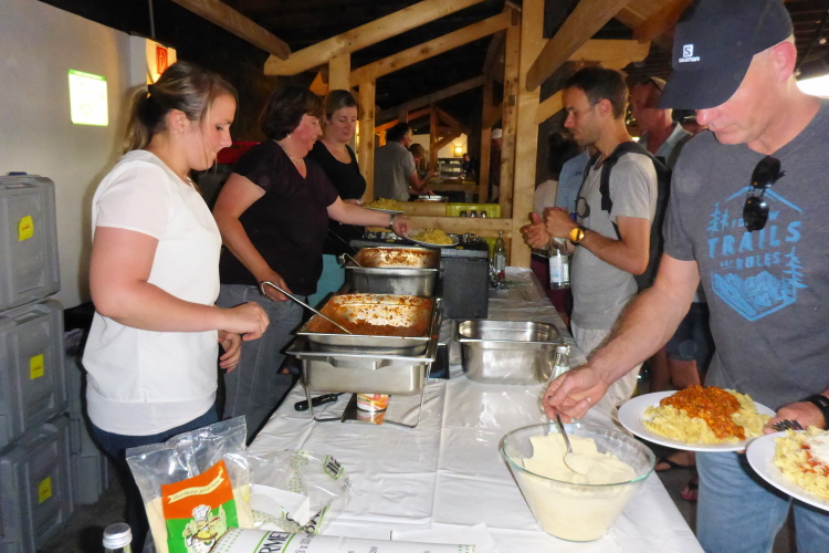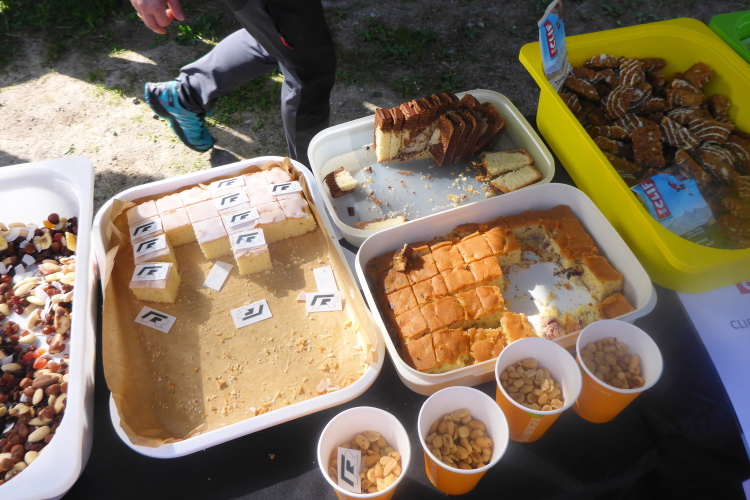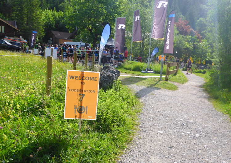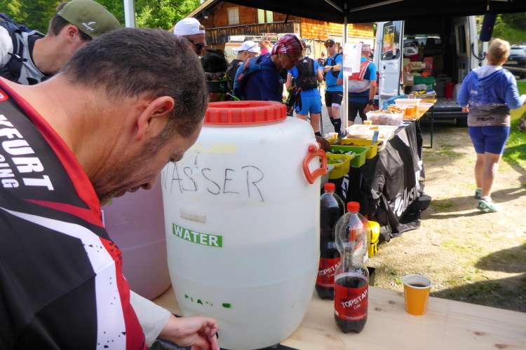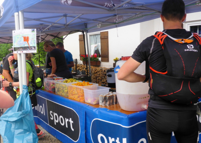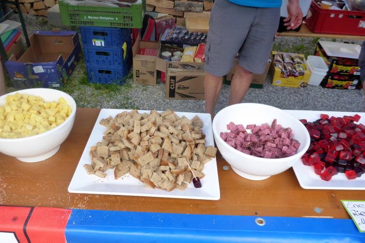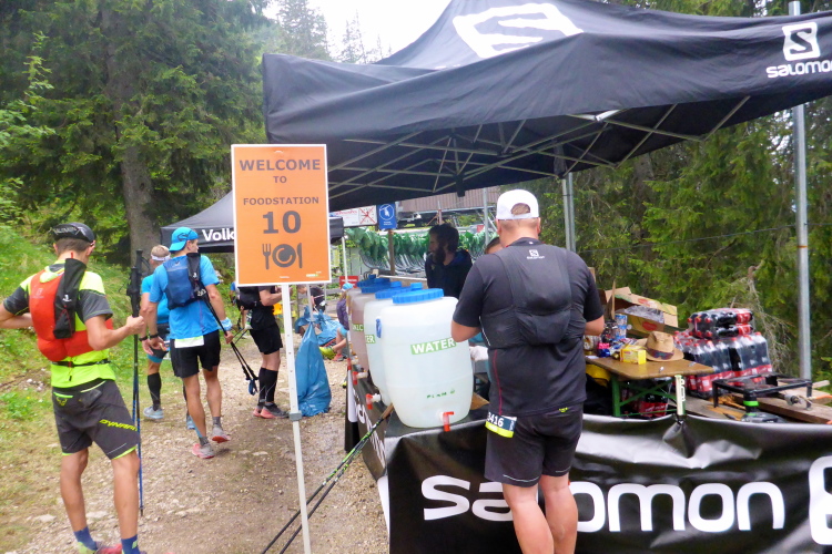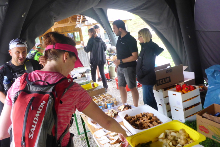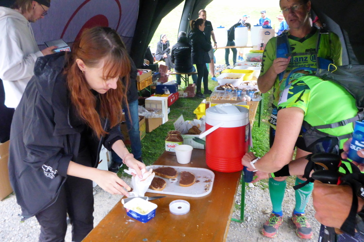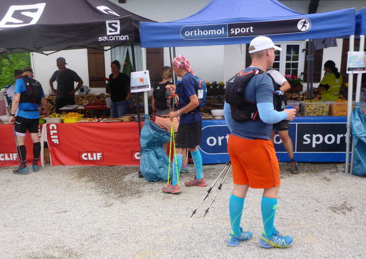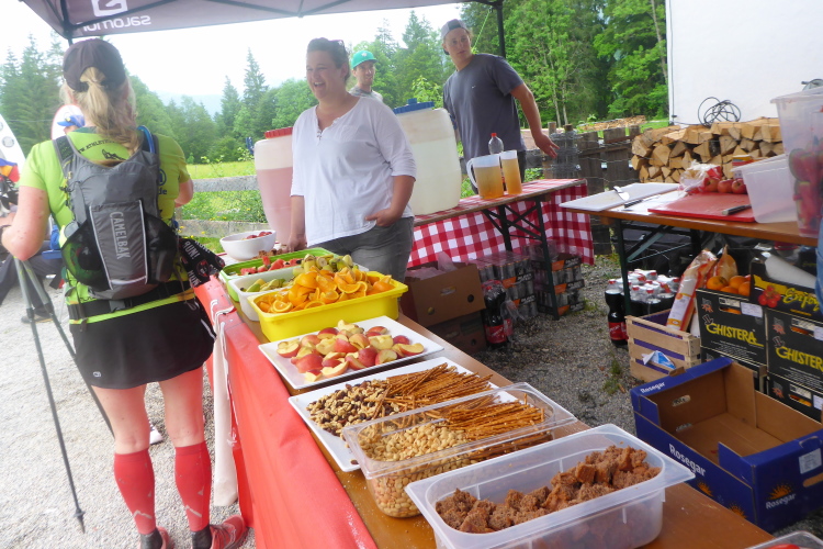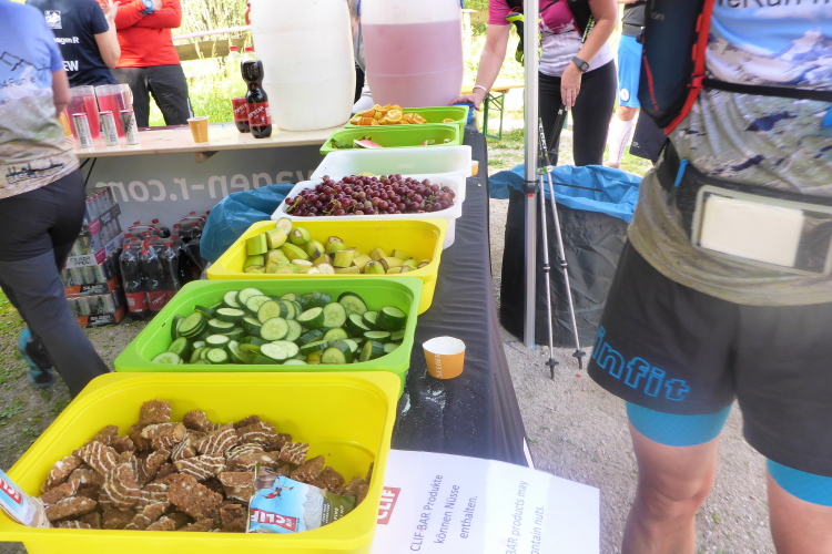Kistenweise stehen geschnittenes Obst und Gemüse bereit. Schüsseln mit Käse und Wurst, Salzstangen, Honigkuchen, wo soll ich nur anfangen zu essen? Die nächste VP kommt in 8 Kilometern, soll ich nochmal eine zweite Flasche füllen? Bisher hat mir mein Vorrat gut gereicht und ich müsste das vielleicht unnötig den Berg hinaufschleppen. Ich beschließe lieber hier genügend zu trinken und und mache mich dann wieder auf den Weg.