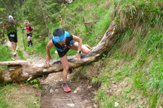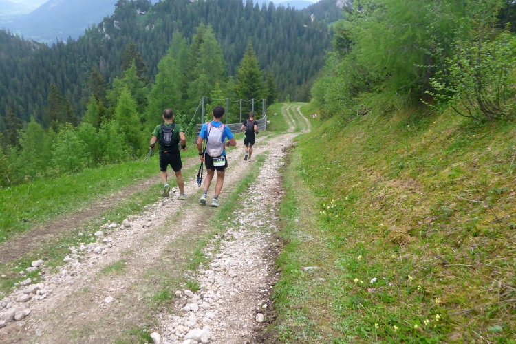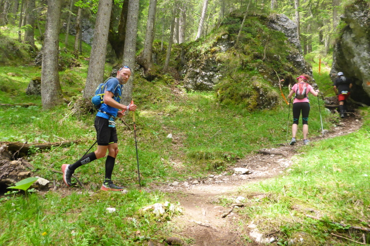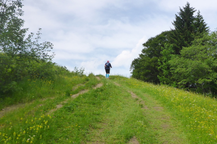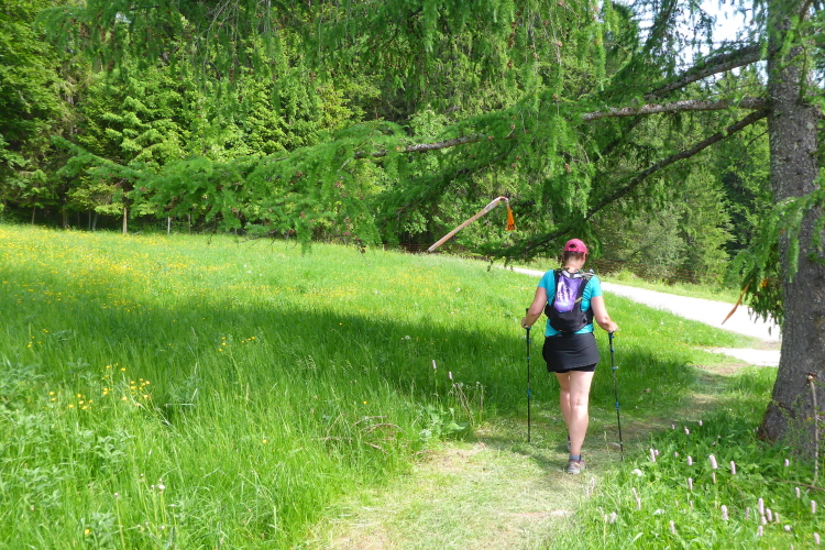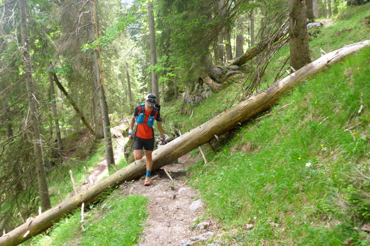 Nach kurzer Pause und Auffüllen meines Getränkevorrats laufe ich weiter. Die nächste VP wird erst in 15 km und mehreren hundert Höhenmetern sein. Mittlerweile ist es schon sehr warm geworden. Auf dem breiten geschotterten Weg komme ich gut voran. Ich bin in netter Gesellschaft mit einer Läuferin aus Norddeutschland. Plötzlich fällt die Strecke unvermittelt in genau dem richtigen Gefälle, so dass ich es gut laufen lassen kann. Gerade noch rechtzeitig erkenne ich einen Pfeil nach rechts auf einen schmalen Bergabtrail. Uff, ich muss bremsen, hohe Stufen und Steine erschweren das Laufen, wegen des Knöchels traue ich mich auch nicht so recht hinunter zu springen.