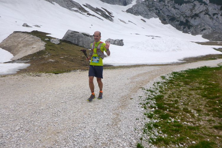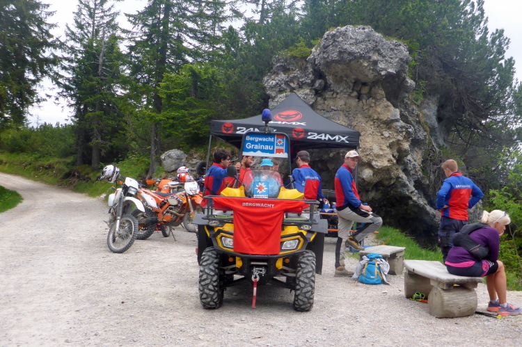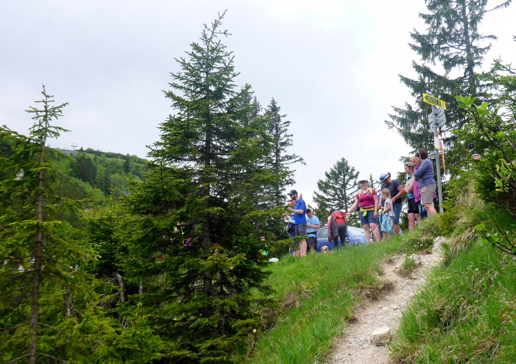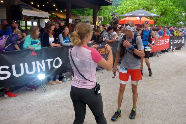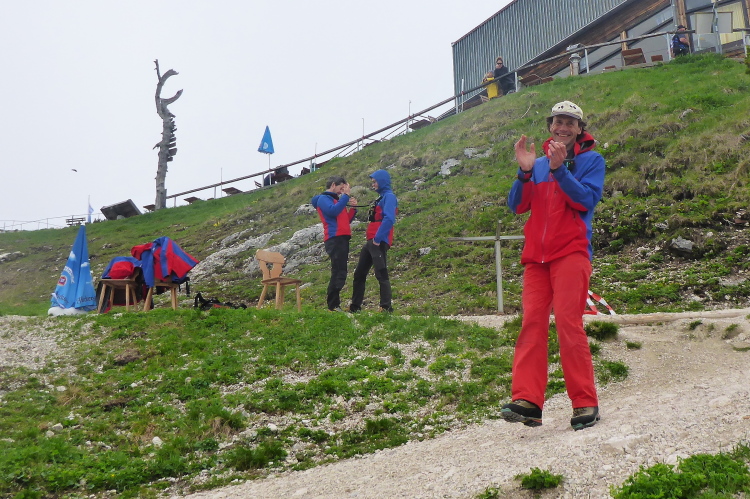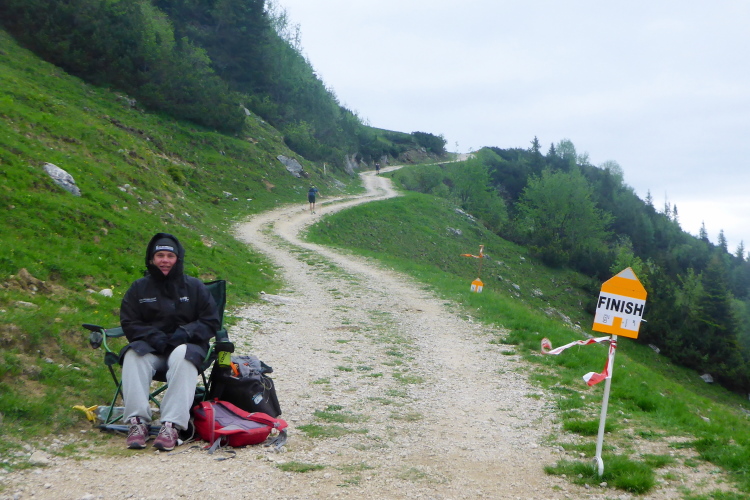 Höre ich da klatschende Zuschauer? Ich kann es kaum glauben, aber gleich bin ich oben. Ich muss kurz stehen bleiben und den Augenblick genießen. Hier oben auf über 1600 m ist ja Highlife. Unter den wachsamen Blicken der Bergwacht wird jeder Ankömmling ausgiebig gefeiert. Wo ist die VP? Ah, da unten ist sie ja. Warum ist der Weg dorthin abgesperrt und die Pfeile zeigen den Schotterweg bergauf?