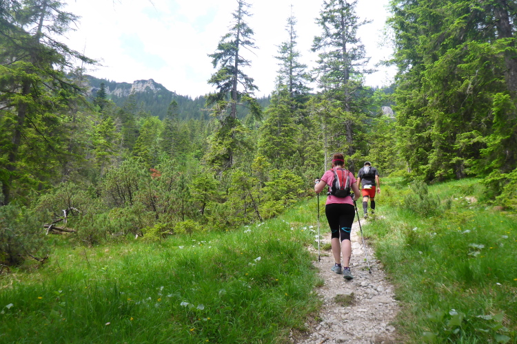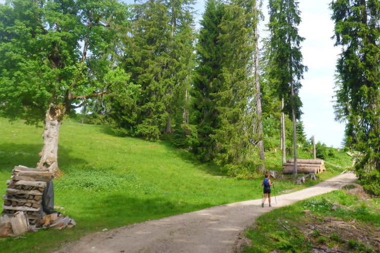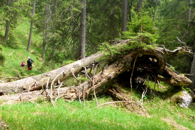 Trotz des steilen Anstiegs bin ich hin und weg vom urigen Wald. Umgestürzte Bäume, bemooste Felsen und zahlreiche bunte Blumen. Dazu eine Luft, wie man sie nur in den Bergen findet - ich fühle mich ganz in meinem Element. Irgendwann bin ich oben, um eine Kurve herum fällt der Weg steil bergab. Aber nur kurz, schon geht es wieder hoch. Dieses Spiel wiederholt sich nun einige Male. Zwischendurch gibt es Aussicht auf Hügel, Wald und Berg.