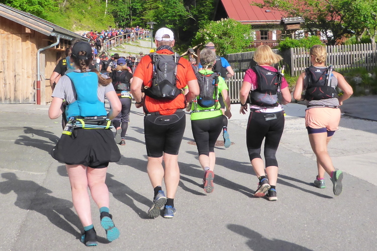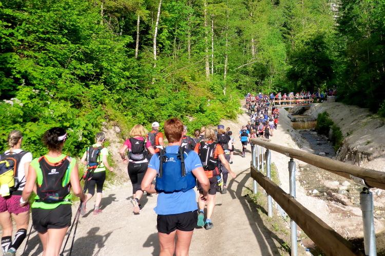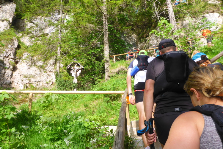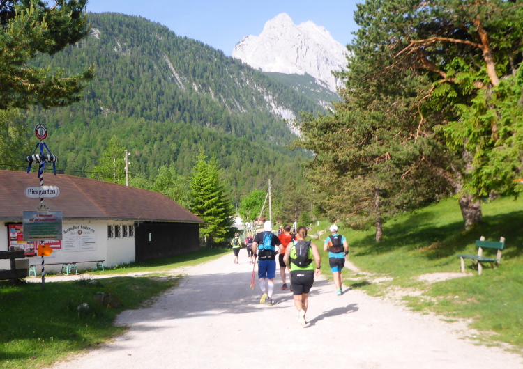 Zunächst laufen wir ein Stück durch Mittenwald, viele Einwohner stehen am Gartenzaun oder auf dem Balkon und feuern uns an. Aber schon bald geht es am Lainbach entlang, über ein Brückchen und spürbar bergauf. Bereits von weitem erkenne ich vor mir Stau. Niemand scheint sich daran zu stören, lustige Sprüche machen die Runde. Es dauert etwas bis wir uns langsam in Bewegung setzen. Vor uns liegt ein schmaler gut gangbarer Pfad in Serpentinen bergauf, direkt am Lainbach, der hier in Stufen nach unten fällt.