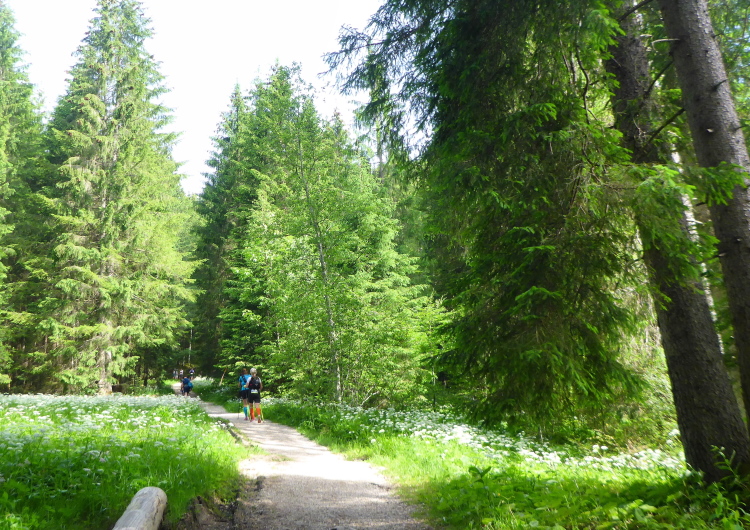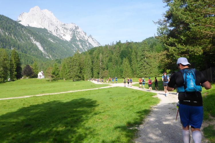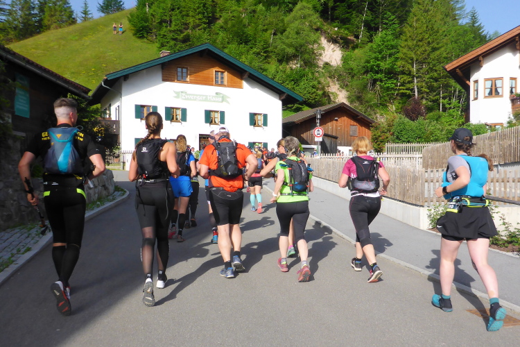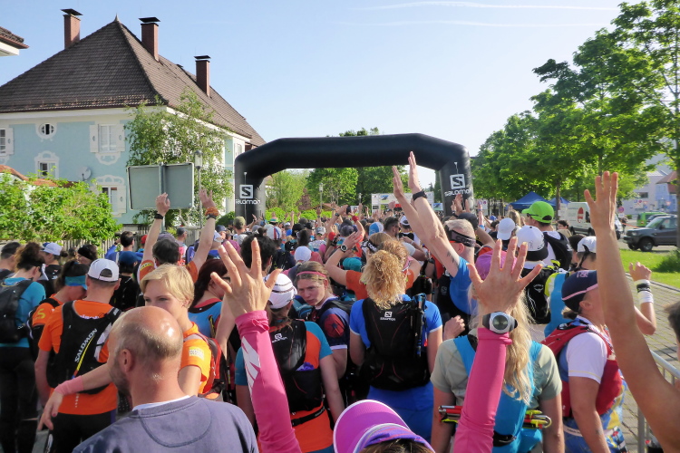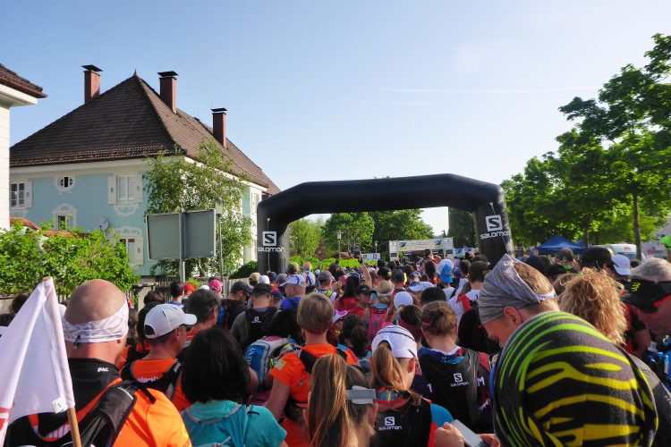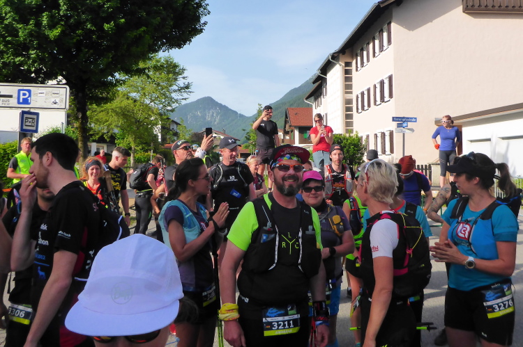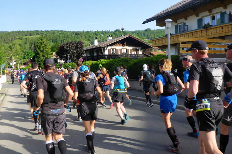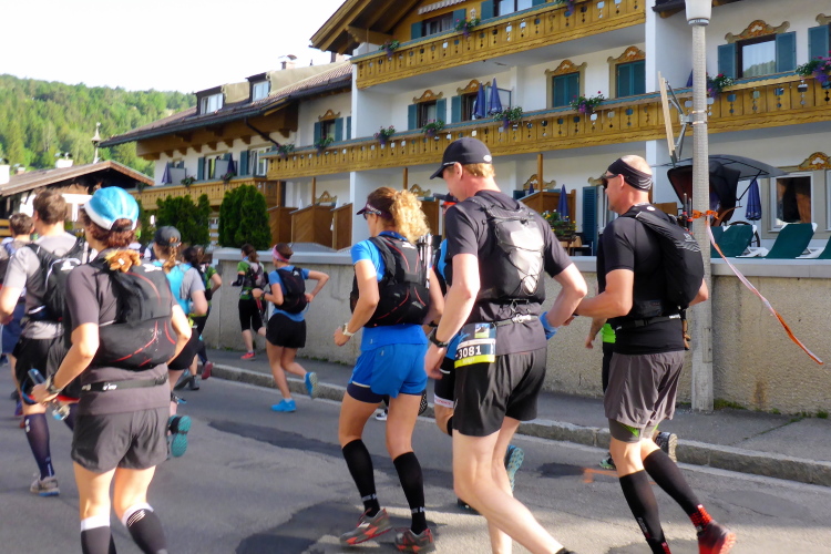 Noch einmal der Hinweis, bei Gewitter den nächsten Verpflegungsposten anzusteuern. Dann dröhnt schon „Highway to Hell“ aus den Lautsprechern, es wird heruntergezählt und der Bürgermeister von Mittenwald gibt das Startsignal. Laura und ich laufen getrennt, sie ist mittlerweile deutlich schneller und ich darf mich nicht hetzen lassen. Das Wetter ist mild und sonnig, das wird ein schöner, warmer Tag.