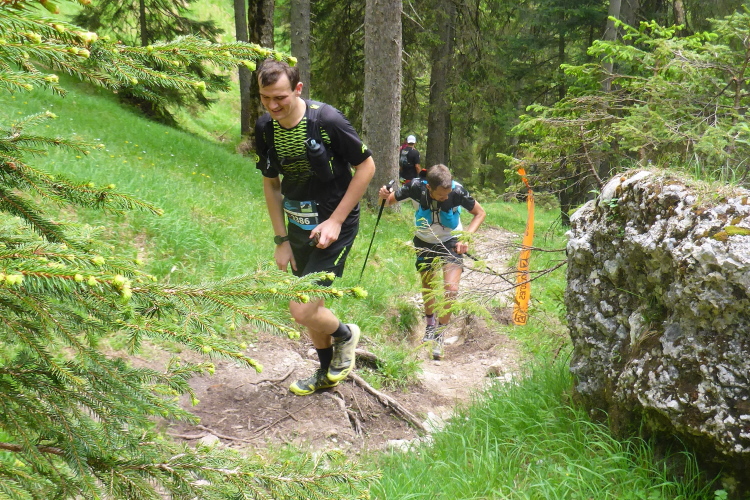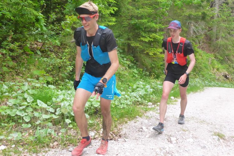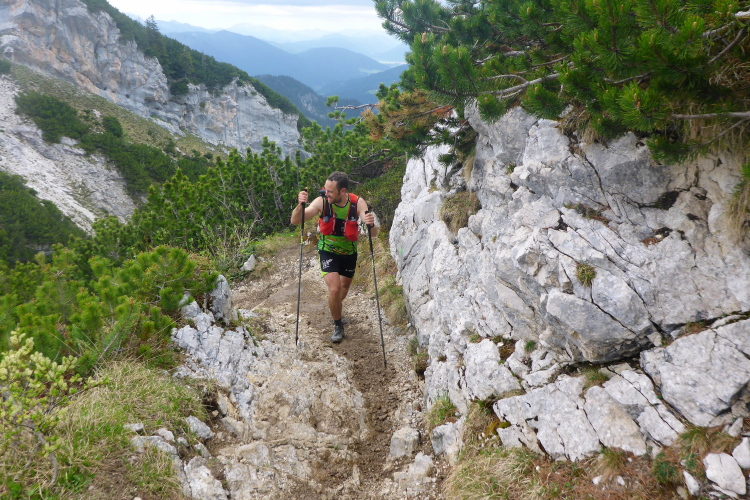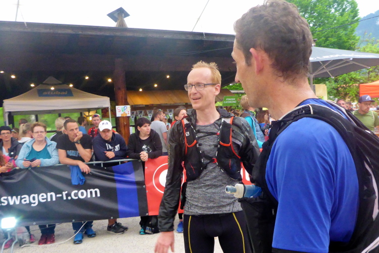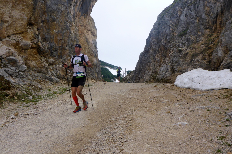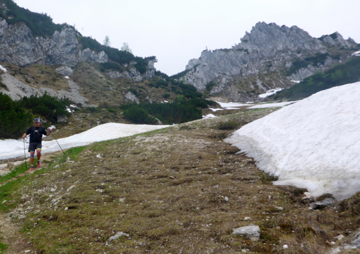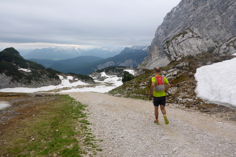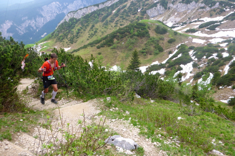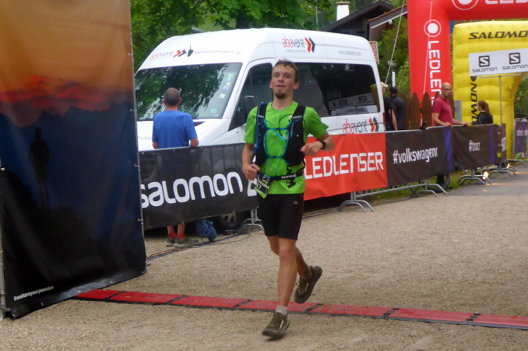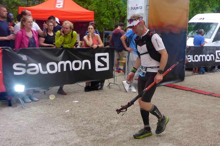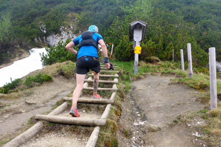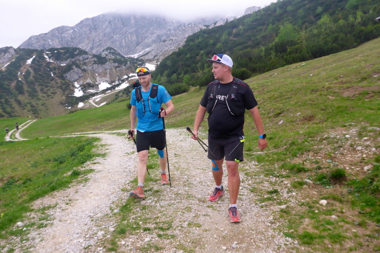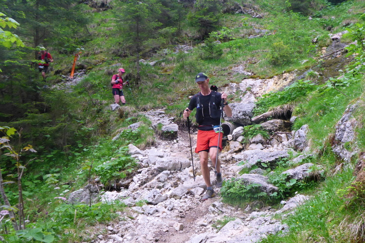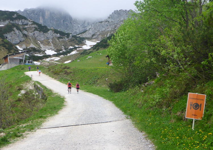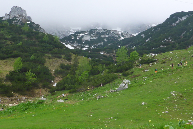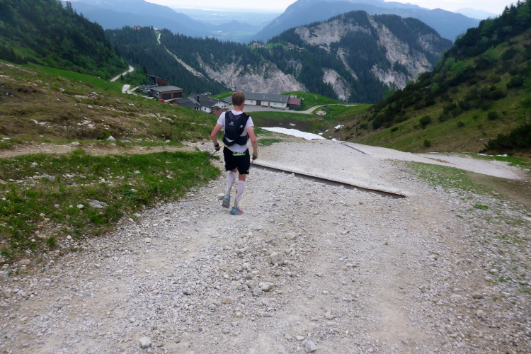 Eigentlich geht es mir gleich besser, weil ich nun weiß, dass es wirklich nicht mehr weit ist. Dafür wird der Weg nun zusätzlich rutschig, weil genau hier ein Rinnsal fließt. Ich erlebe nicht nur einmal, wie selbst gute Läufer ins Rutschen kommen und sich nur mühsam auf den Beinen halten können. Auch die Läuferin von vorhin, die mir netterweise einen Stock leihen wollte, hat es erwischt, sie hat sich an einem Absatz den Fuß verdreht - das sieht nicht gut aus. Zwei Helfer sind schnell zur Stelle und so kann ich leicht geschockt weiterlaufen.