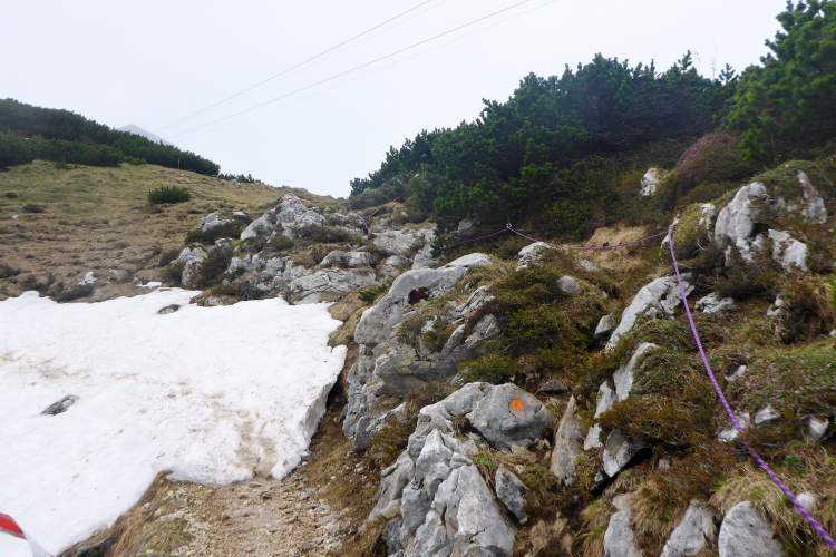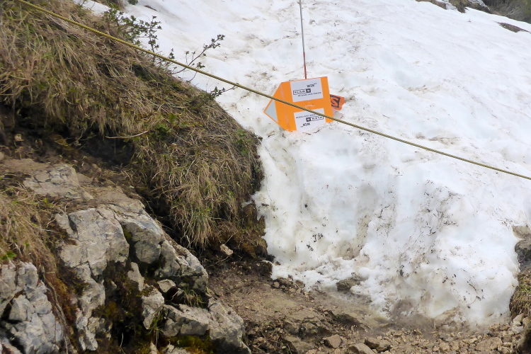 An einem Schneefeld sind Seile gespannt. Im Briefing wurde versprochen, dass es wirklich fixe, also feste Seile wären nicht nur Absperrungen. Bei mir klappt das Hochziehen auch ganz gut. Der Weg wird steiler und ausgesetzter, aber noch kein Grund zur Panik. An einer engen Stelle sind fixe Stahlseile gespannt. Ich komme gut darüber. Der Schnee ist in den letzten Tagen weniger geworden, manche der angebrachten Sicherungsseile sind nur noch Dekoration. An einer Stelle muss man klettern, das würde auch ohne Seil gehen, aber wenn sie schon mal da sind, nutze ich sie auch.