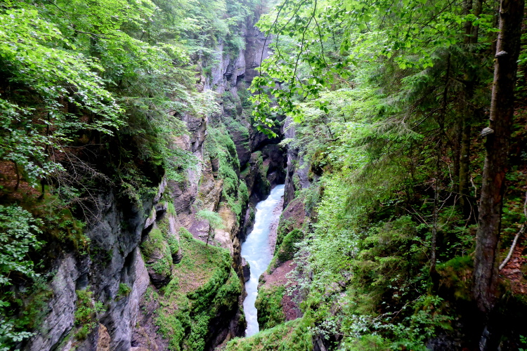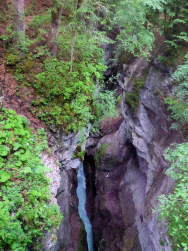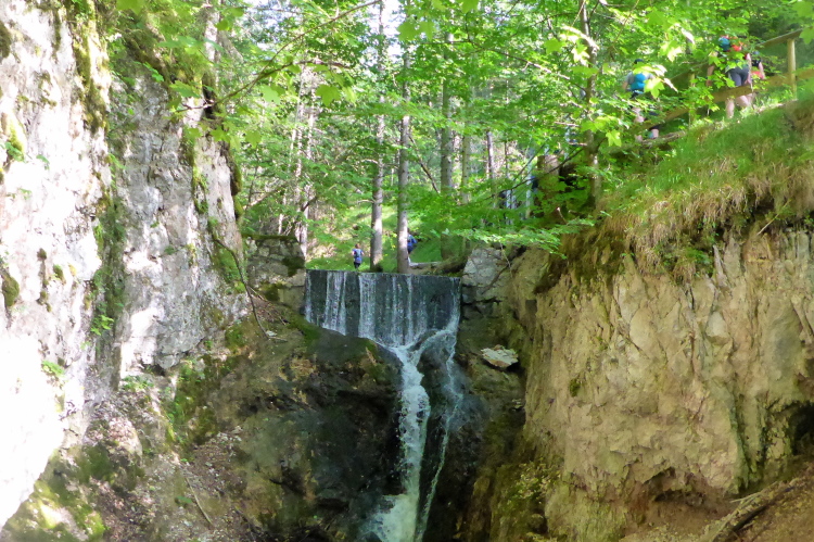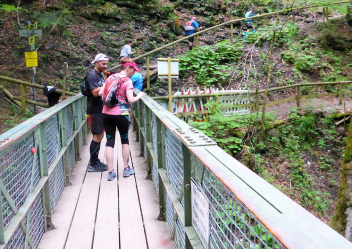 Steil führt der Pfad nach unten zur eisernen Brücke. Sie überspannt die Klamm in 68 m Höhe und bietet einen kleinen Einblick, was den Besucher des 700 m langen Naturdenkmals erwartet. Der eigentliche Weg führt unten nahe am Wasser durch Höhlen und enge Steige. Für uns geht es nun wieder bergauf, und das ziemlich steil.