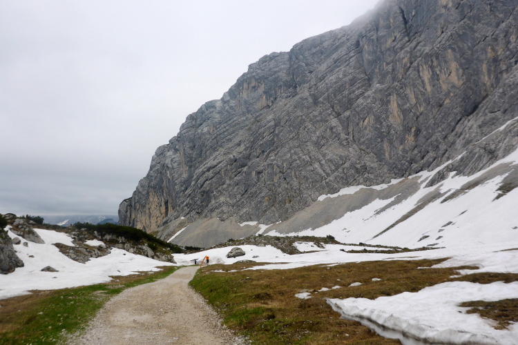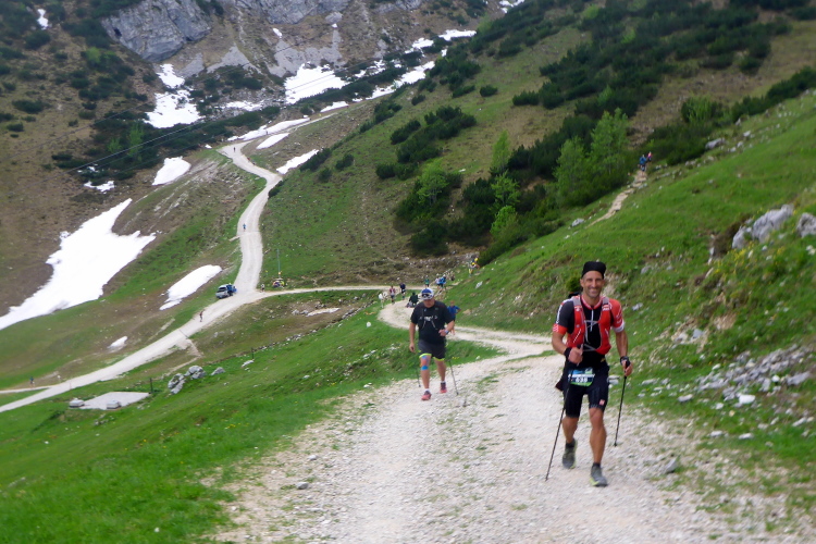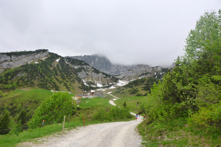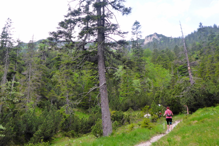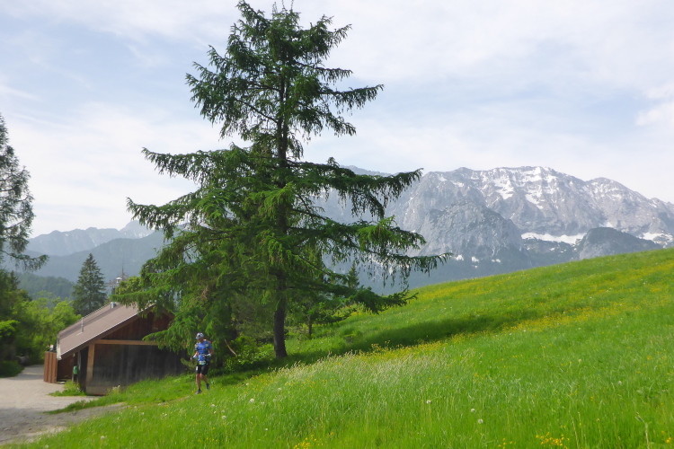 Dafür geht der Weg nun steil bergauf. Reizende Abwechslung bietet eine Lichtung mit den weißen Blüten von Giersch, der hier in Mengen wächst. Die Tür am Weidezaun steht offen und so gelangen wir auf die Elmauer Alm. Eine Fotografin schießt Läuferbilder vor dem Hintergrund des Bergmassivs, das nun richtig nah erscheint. Die Almhütte liegt auf 1200 m ü. M., Wanderer machen auf den gemütlichen Bänken Rast; auch die Bergwacht ist präsent. Fast hätte ich ebenfalls eine Pause eingelegt, aber die Vermutung, dass der Weg nun flacher wird, lässt mich weiterlaufen. Vielleicht einen Kilometer weiter geht es aber schon wieder deutlich bergauf.