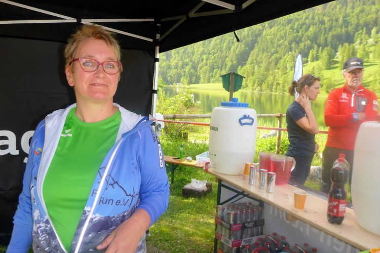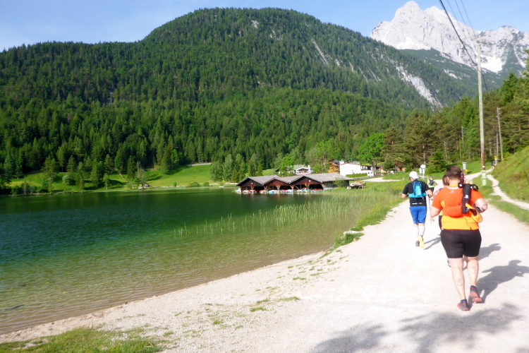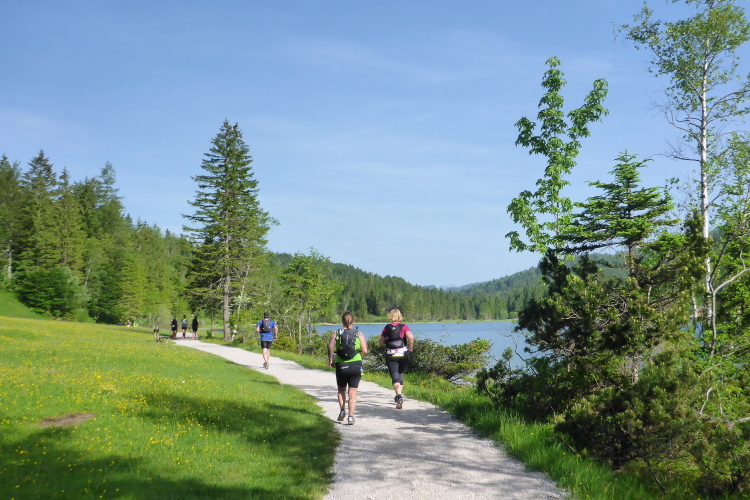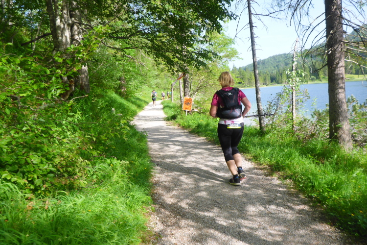 Wieder aus dem Wald heraus, befinden wir uns schon am Ferchensee. Der Weg am Ufer entlang ist ein Traum. Auf der gegenüber liegenden Uferseite können wir die erste VP am Gasthaus Ferchensee erkennen. Die Verpflegungsstation V7 bei km 5,4 ist großzügig eingerichtet. An mehreren Tischen versorgen uns Helfer mit diversen Getränken und am Buffet gibt es allerlei Kuchen, Obst (sogar Ananas), Nüsse, Käse, Wurst und Brot. Ab hier sind wir nun auf der Strecke, die auch die Läufer der langen Distanz zu bewältigen haben. Die können aber noch nicht hier sein, weil die V7 der Supertrail-Strecke ungefähr bei km 30 ist.