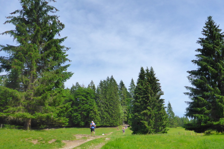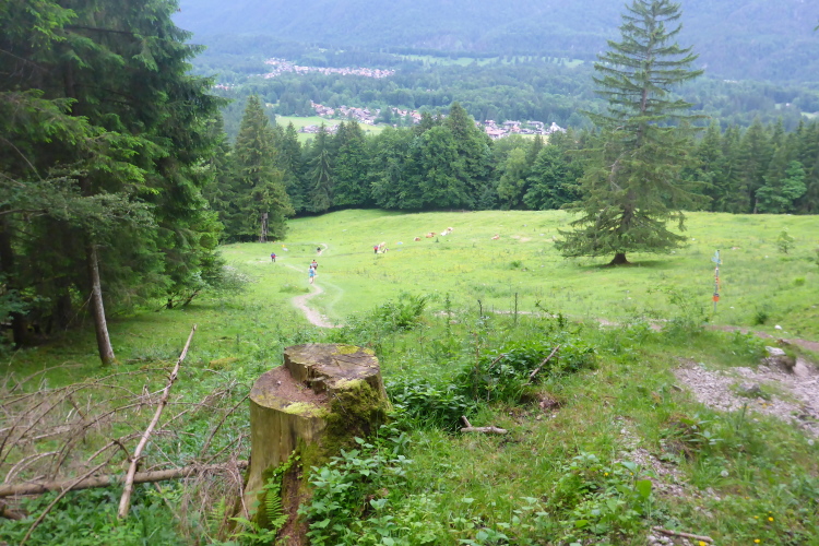 Eine Kurve weiter bergab stellt sich heraus, dass diese Wünsche noch etwas verfrüht sind. Ich kann die Hochalm zwar schon sehen. Aber sie liegt noch sehr weit unten. Ein paar steile Stellen später bin ich jetzt endlich doch auf dem Weg von vorhin und darf nun gerade aus weiter. Erneut genieße ich den Umstand, dass ich noch lange nicht Letzte bin. Außerdem sind noch die Schnellen, die den Supertrail in weit unter 10 Stunden finishen werden, unterwegs.