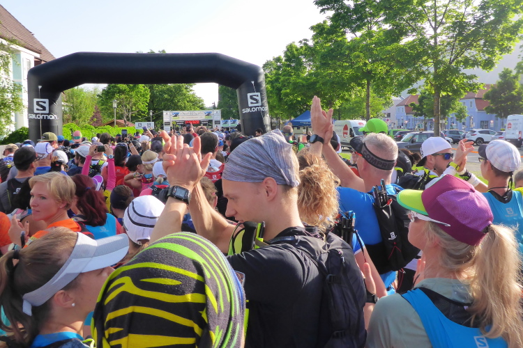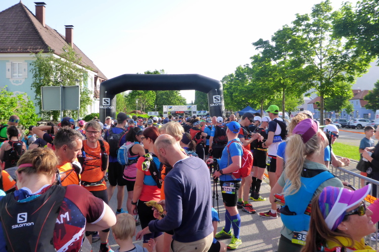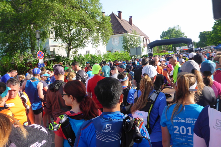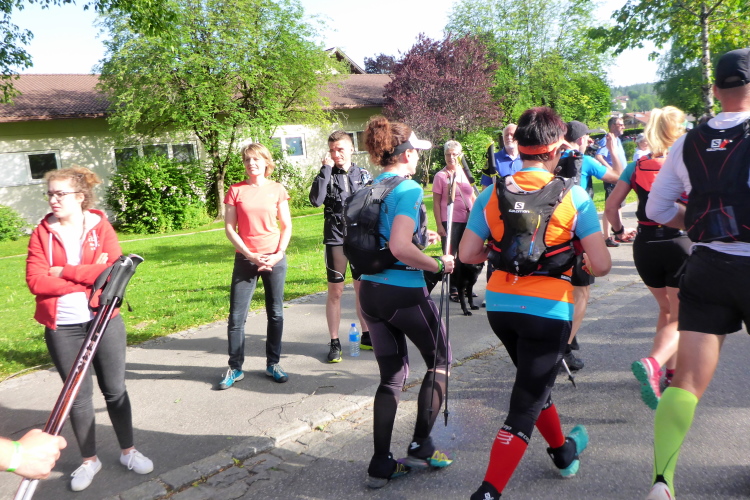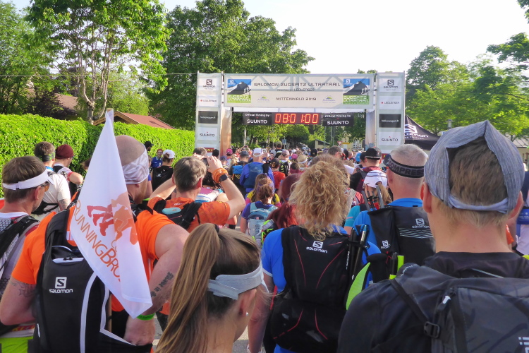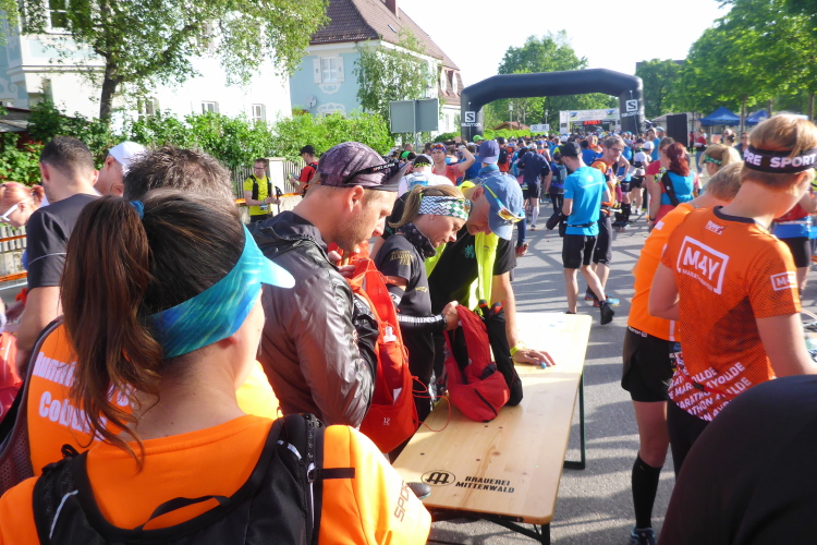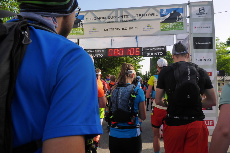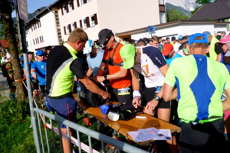 Laura und ich kommen so gegen 7 Uhr in Mittenwald auf dem Bahnhofsvorplatz an. Die Zeit reicht, um unsere Taschen mit den Wechselkleidern abzugeben und um 10 Minuten vor dem Start an der Kontrolle der Pflichtausrüstung anzustehen. Diese erfolgt stichprobenartig mit Augenmerk auf Handy, genügend Wasser und einem Notfallset. Regenjacke finde ich ebenfalls wichtig, vorgeschrieben ist noch das Mitführen langer Laufbekleidung, sowie Mütze und Handschuhe.