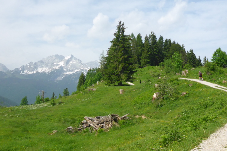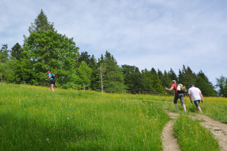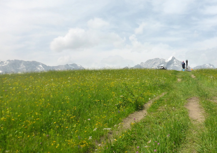 Die nächsten 2 km geht es tendenziell bergab. Teilweise ist es so steil, dass ich richtig abbremsen muss. Unten warten zwei Streckenposten, dann geht es wieder bergauf. Hinter einer Hütte wird es steil, zwischen blühenden Wiesen führt der Grasweg hinauf. Der Gipfel des Eckbauern mit Christuskreuz liegt auf 1200 m Höhe. Ein Bauernpaar macht Heu auf althergebrachte Weise mit Sense und Rechen - eine mühsame Arbeit. Auch einige Wanderer sind unterwegs, der Gipfel ist mit der Seilbahn gut zu erreichen. Etwas unterhalb ist die Sonnenterrasse des Berggasthofs gut besucht.