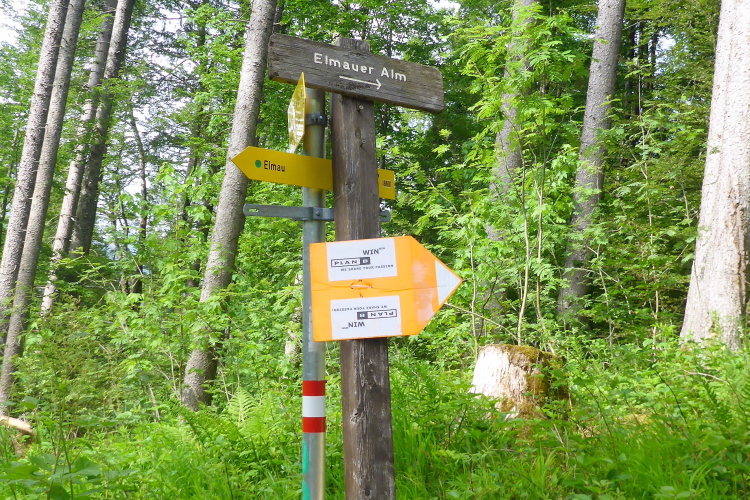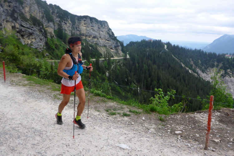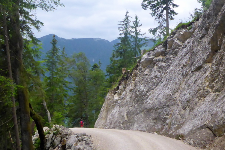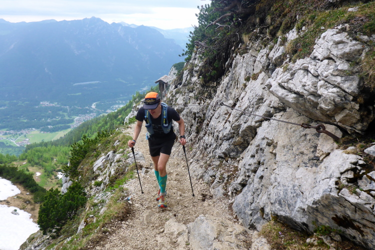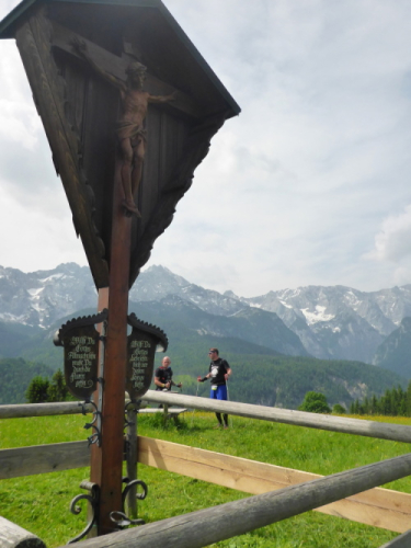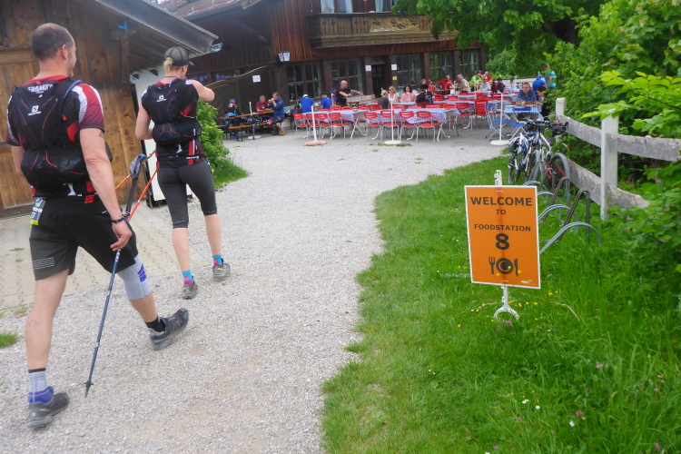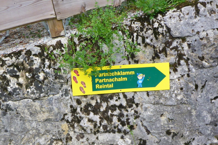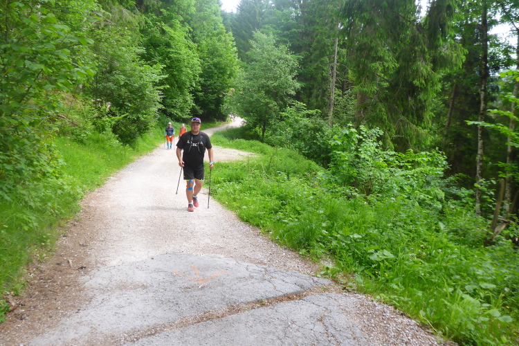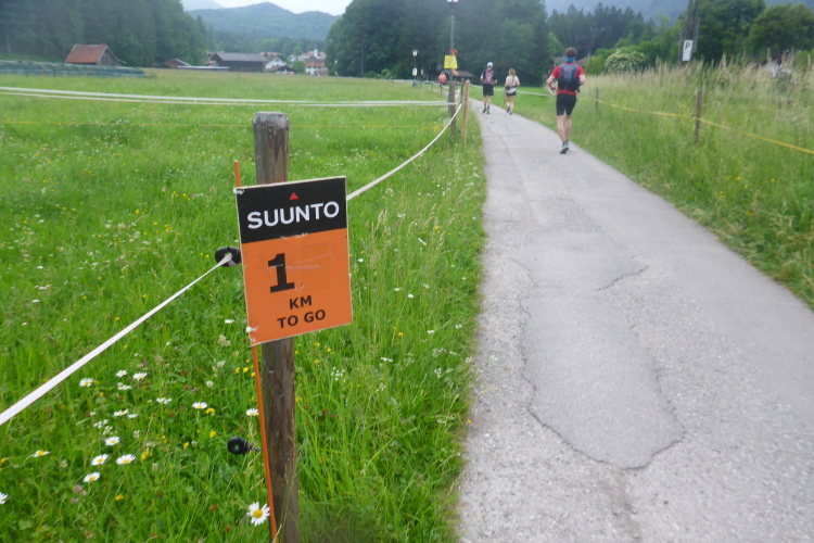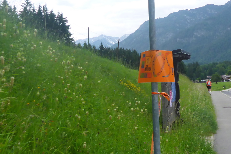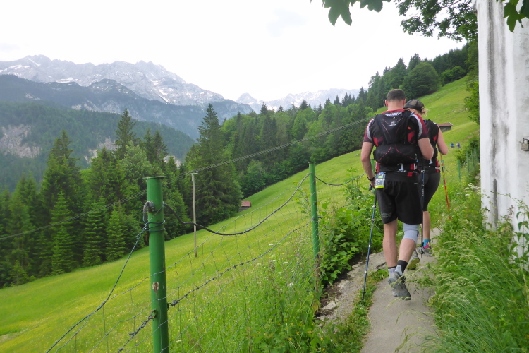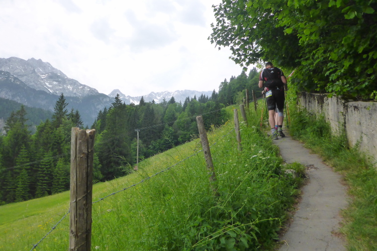 Das Wetter ist jetzt nicht mehr so schön, es hat zugezogen. Hoffentlich hält das noch. Dafür ist es nicht mehr so heiß. Ein wunderbarer schmaler, aber gut ausgebauter Wanderweg führt durch lichten Wald nach unten. Endlich kann ich einmal rennen, schon um mal andere Muskeln zu belasten. „20 km to go“, die Straße hat immer noch Gefälle, ich bin gut dabei. Am Eventhotel Graseck füllen Läufer ihre Flaschen am Wasserhahn. Ein Schild weist den Weg zur Partnachklamm.