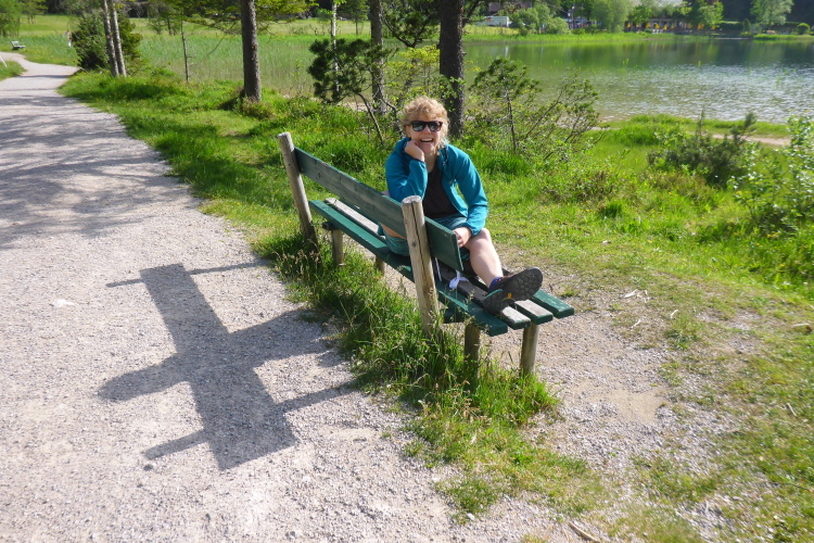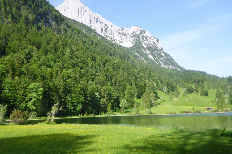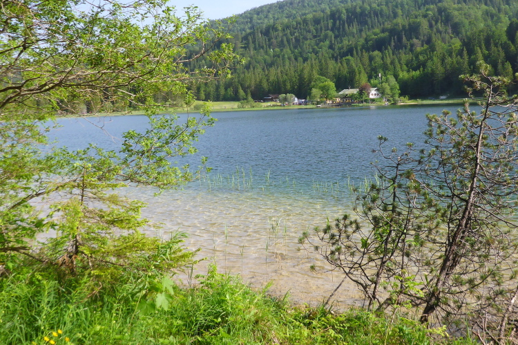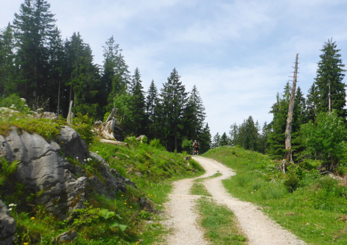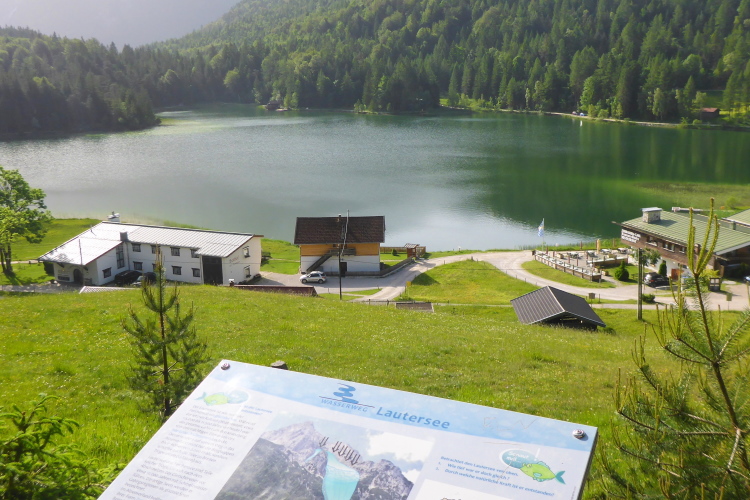 Schnell erreichen wir den ca. 12 ha großen Lautersee, der auf 1000 m Höhe liegt. Der Biergarten hat wohl noch geschlossen und so liegt der blaue See wunderbar ruhig im Sonnenlicht. Unser fein geschotterter Weg führt an der Lautersee Alm nach oben, wir gewinnen schnell an Höhe. Nun wird es auch stellenweise trailig, es geht auf und ab. Ein erster Test für meinen lädierten Knöchel verläuft positiv. So kann es weiter gehen.
