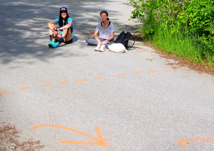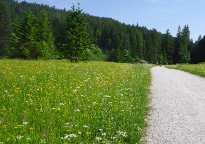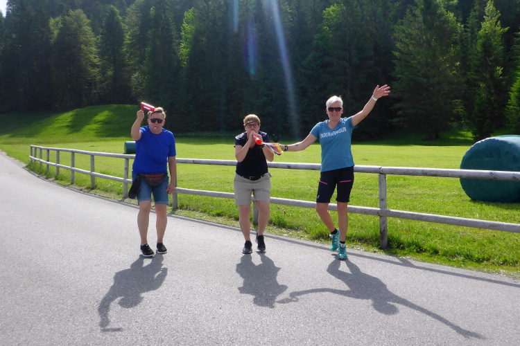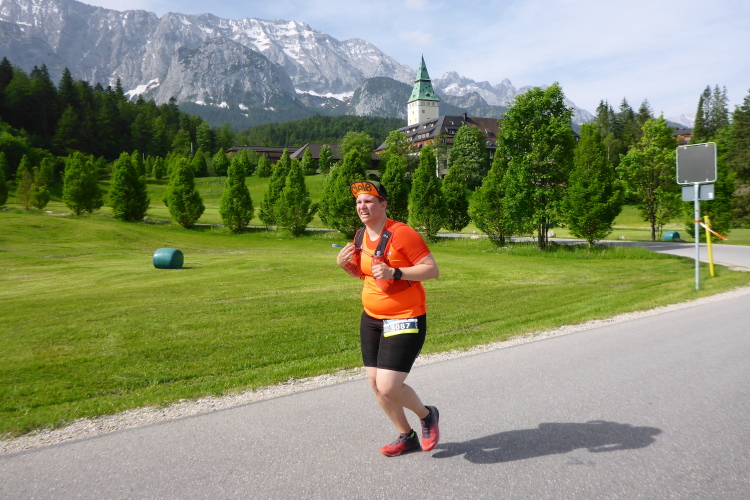 Ich bin froh, als ich heil unten ankomme. Zwei Mädels sitzen am scharfen Abzweig. Geradeaus vor mir liegt Schloss Elmau, bekannt durch den G7 Gipfel 2015. Hier im abgeschiedenen Hotel trafen sich die Regierungschefs der ganzen Welt, um die Grundlagen des Klimavertrags von Paris vorzubereiten. Im Vorfeld des Gipfels wurden schöne Straßen gebaut, die wir nun entlanglaufen. Die Wiesen rundum stehen in bunter Blüte. Streckenposten und ein kleines Fangrüppchen machen Stimmung.