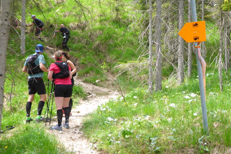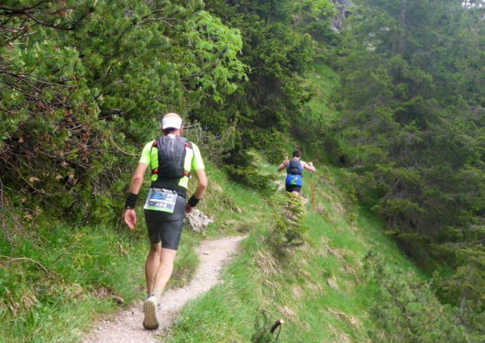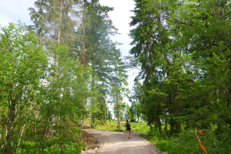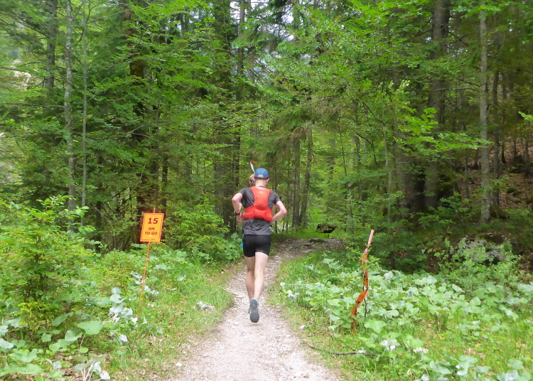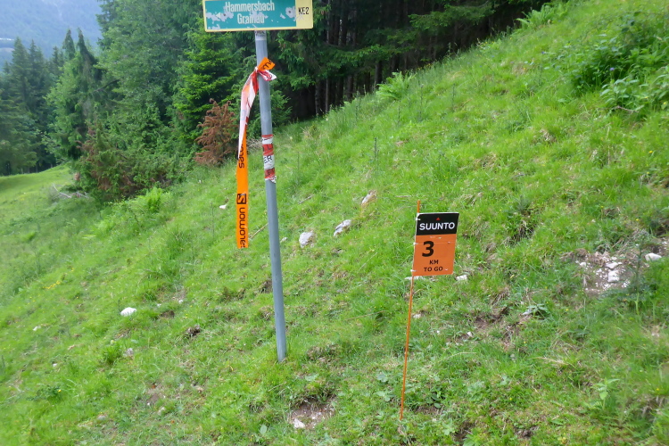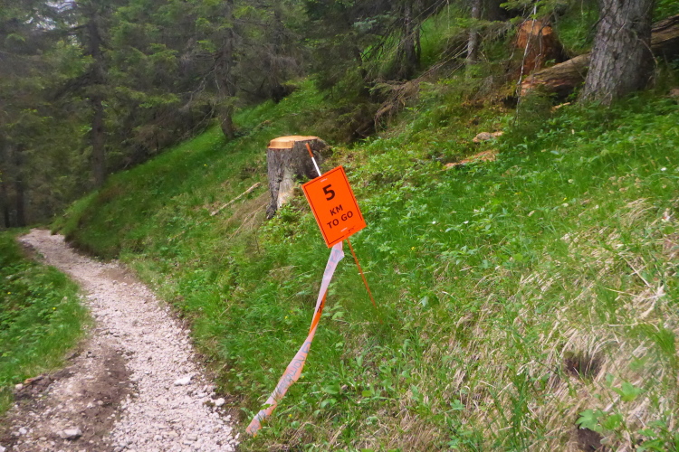 Zunächst führt ein breiter Schotterweg auf und ab. Hier kommt der erste Läufer des Supertrail mit langen Schritten vorbei gejoggt. Ich bin so überrascht, dass ich vergesse, ihn anzufeuern. An einer Hütte entspannen Bergwachtmänner, es sei ihnen gegönnt. Dann ab km 23 beginnt ein 10 km langer Anstieg mit insgesamt 1000 Höhenmetern. Immer wieder überholen nun Ultras, zu erkennen am kraftvollen schnellen Schritt. Der Schotterweg biegt bei „km 15 to go“ in einen schönen Trail. Das Gelände ist perfekt mit Flatterband markiert. So sieht man schon von weitem, wo es hingeht.