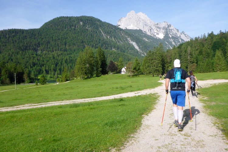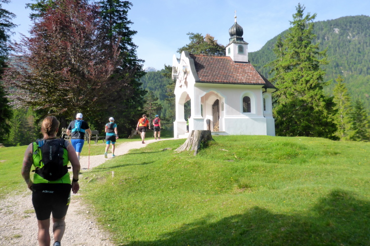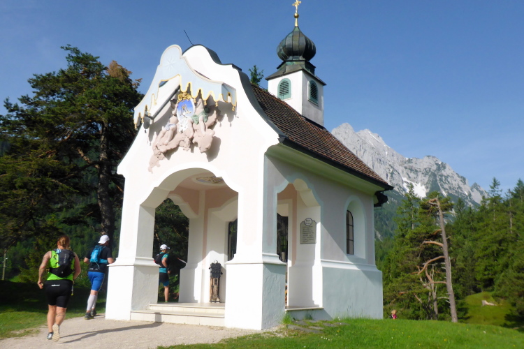 Ich gelange zügig nach oben, dann wird es flacher. Ein Mitarbeiter der Bergwacht verabschiedet uns. Auf schmalem Pfad verlassen wir den Wald und laufen zwischen Wiesen zur Maria-Königin-Kapelle. Dahinter liegt malerisch das Karwendelmassiv. Wir laufen direkt an der Kapelle vorbei und ich bewundere die aufwändige Gestaltung des Firstes und die bunten Vorraum- und Deckenfresken.