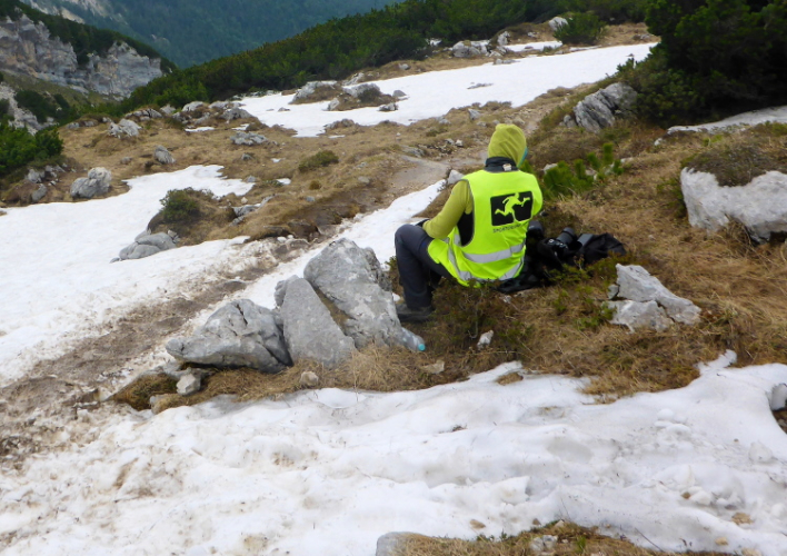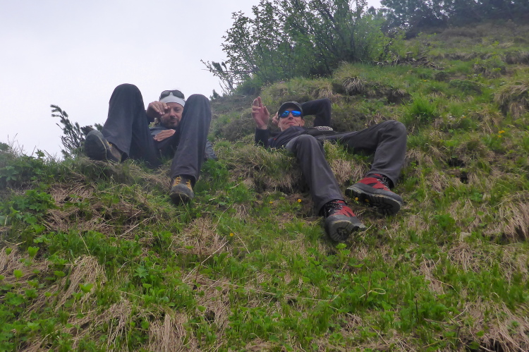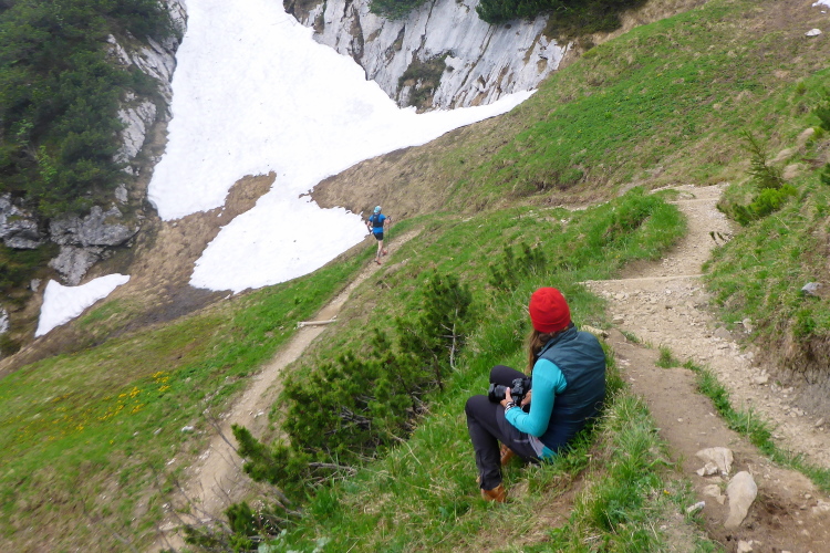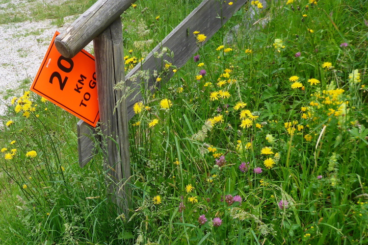 Vor mir liegt eine weite Wiese, mehrere Wege führen hinunter. Ich merke, dass mich ein Bergwachtmitarbeiter von unten beobachtet. Locker laufen geht nicht und so tue ich, als würde ich dauernd fotografieren. Nicht, dass er merk, wie platt ich bin. Als ich ihn passiere, beglückwünscht er mich zur Leistung und meint, es wären nur noch 750 m steil bergab – das ist kein Witz.