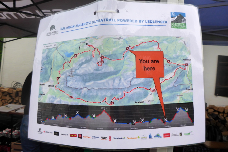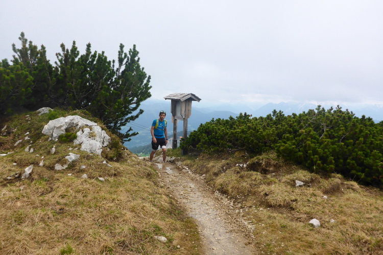 Dann bin ich doch oben mit einem Rundblick vom Feinsten. Zwei Bergwachtler haben es sich im Unterstand gemütlich gemacht und feuern mich an. Hinter dem Schild, das mir „25 km to go“ ankündigt, kann ich zum ersten Mal den markanten Gipfel der Alpspitze erblicken. Dort unterhalb des großen Schneefeldes sollte der Osterfelder Kopf liegen, um den müssen wir herum. Das ist noch weit.