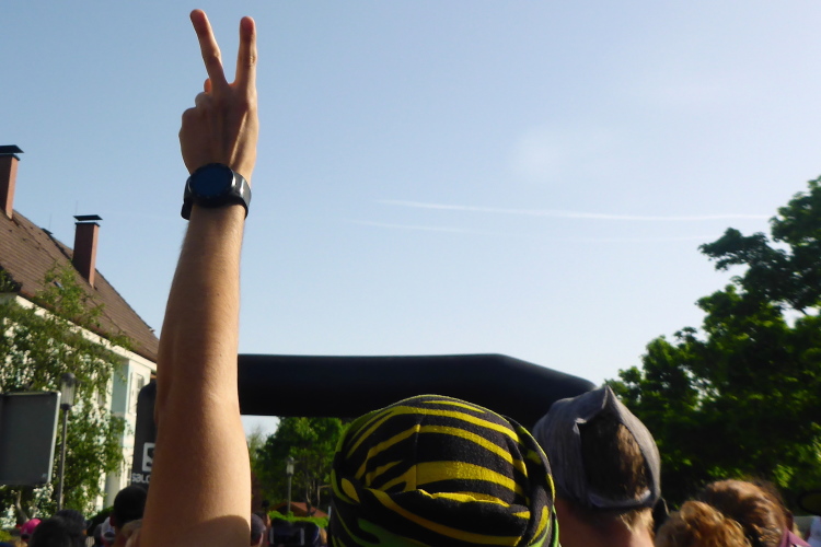 Passanten motivieren und feuern mich an. Trotz wackeligen Beinen fühle ich mich gut. Vor der letzten Kurve beginnt es tatsächlich ohne Vorwarnung zu schütten, so dass ich klatschnass das Ziel erreiche. Das Publikum tobt. Erleichtert nehme ich meine wohlverdiente Medaille in Empfang.