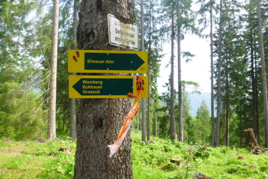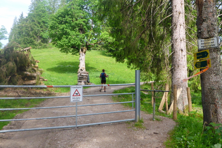 Der Wanderweg geht nun tatsächlich nochmal bergauf. Wow, sind meine Beine müde. Hilfe, ich kann nicht mehr! Trotz moderatem Gefälle kann ich nur noch gehen. Es dauert daher lange, bis ich die V10 am Kreuzeck erreiche. Hier setze ich mich erst einmal auf die Bank und verpflege mich ausgiebig. Jetzt geht es nur noch ca. 4 km steil den Jägersteig hinunter und dann noch 2 km im Ort bis zum Ziel im Musikpavillon. Das schaffe ich locker in insgesamt weniger als 9 Stunden.