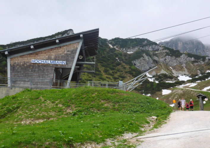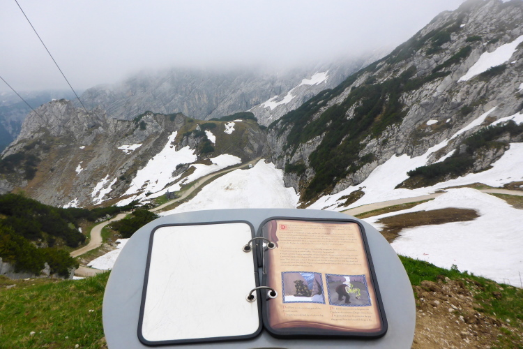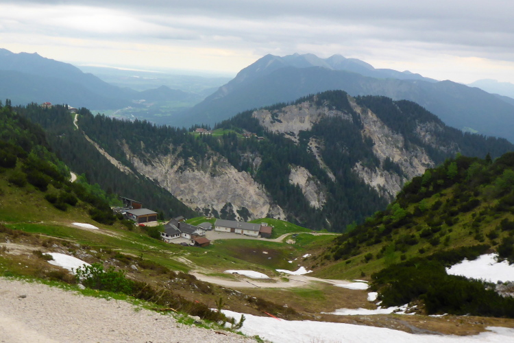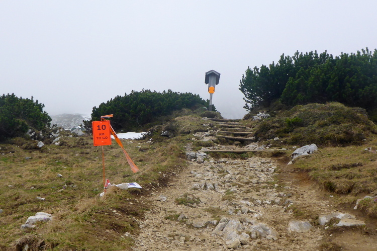 Der Weg führt am Hang entlang, Berge soweit das Auge reicht. Um eine Kurve herum kommt nun die Hochalmbahn in Sicht, etwas weiter müsste der Alpspitzgipfel liegen, leider im Nebel verborgen. Neben der Seilbahn und der geschlossenen Hütte liegt die V9, bei 27,4 km und 1700 Höhenmetern.