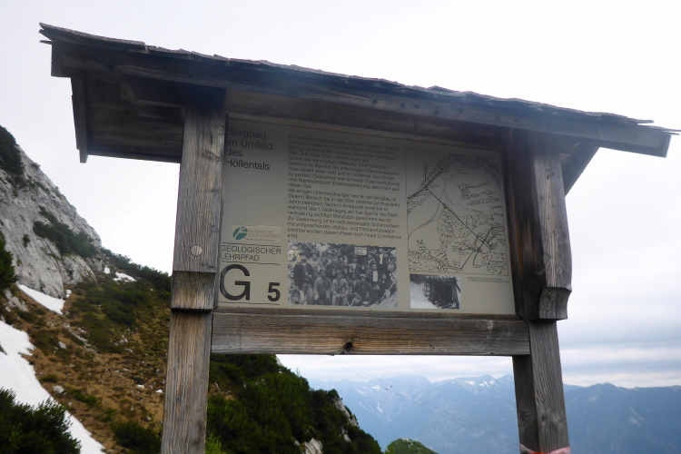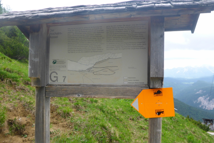 Hier herrscht ganz schöner Läuferverkehr: von links kommen Schnelle den Berg heruntergerannt. Wir biegen zunächst auf den gleichen Weg, werden dann aber vom Streckenposten nach oben geleitet. Ein steiler, aber gut präparierter Weg steigt Richtung Gipfel. Große Tafeln zeigen, dass wir uns wohl auf einem Geologischen Lehrpfad befinden. Wenn ich Zeit hätte, könnte ich sicher allerlei Wissenswertes erfahren.