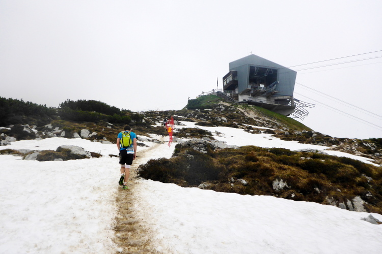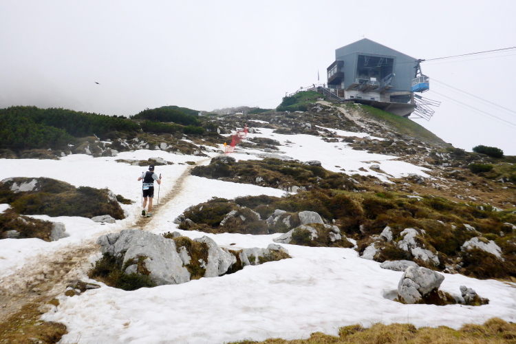 Der nächste Fotograf verspricht mir noch 75 Höhenmeter, das entspricht auch meiner Messung. Hier steht nun auch das „10 km to go“ Schild. Hinter der nächsten Kurve kommt die Bergstation der Alpspitzbahn auf dem Gipfel des Osterfelder Kopfes in Sicht. Noch einmal über ein Schneefeld, dann ein paar letzte Schritte und ich bin oben auf 2050 m. Ein weiterer Mitarbeiter der Bergwacht in warmer Jacke beglückwünscht jeden der ankommt und mahnt zur Vorsicht beim Abstieg.