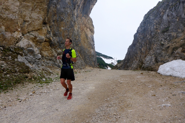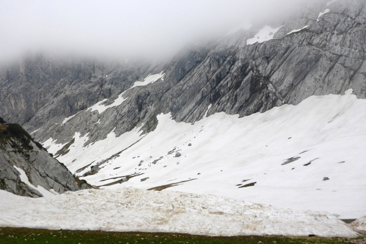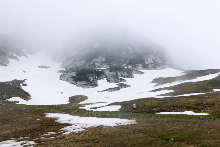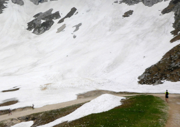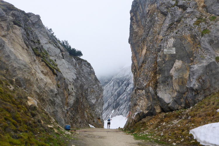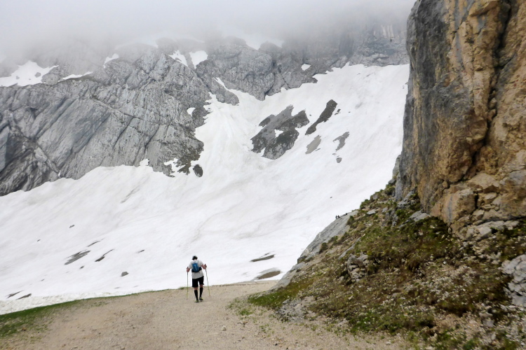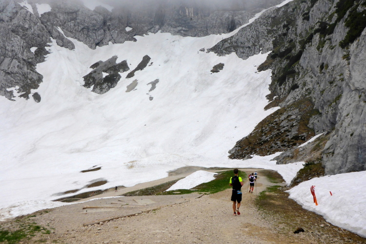 Gleich bin ich an selber Stelle und muss erst einmal anhalten. Völlig unerwartet stehe ich vor einem atemberaubend hohen Felsen, zu dessen Füßen sich ein Mantel aus weiß glänzendem Schnee ausbreitet. Der obere Teil der Felswand steckt im Nebel; ich habe das Gefühl, in einem schwarz weiß Bild zu stecken. Den anderen Läufern geht es ebenso. Wirklich jeder bleibt erst einmal stehen und macht ein Foto. Dann laufen wir uns in weiteren Serpentinen abwärts. Langsam machen meine Oberschenkel zu. Ich muss die steilen Stücke vorsichtig gehen, Schmelzwasser fließt über den Weg und ich hab Angst wegzurutschen.