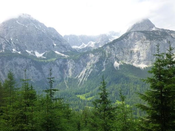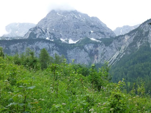 Wild romantisch ist die Lage des vor 3.700 Jahren infolge eines Bergsturzes entstandenen Eibsees mit seinen acht kleinen Inseln und dem klaren, unwirklich grünen Wasser. Schade ist nur: Von all dem bekomme ich nichts zu sehen. Zumeist blickdicht umgibt uns das Gehölz und durch dichtes Grün geht es weiter bergan. Nur selten geben Lichtungen einen kurzen Blick auf die Berge frei und erinnern uns daran, wo wir uns befinden.