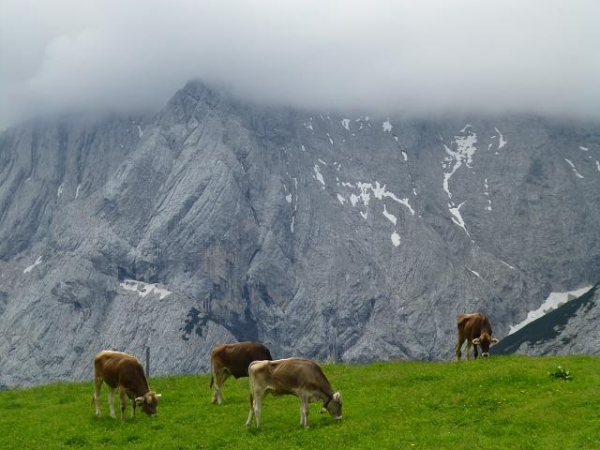 Bei km 24 endet der Koppensteig und wir schwenken über einen komfortablen Forstweg langsam ansteigend ab ins Gaistal, welches Wetterstein- vom Mieminger Gebirge trennt. Rund um die Ehrwalder Alm (1502 m üNN) erwartet uns eine alpine Bilderbuchkulisse: Weite, mit gelben Butterblumentupfern übersäte Wiesen im breiten Talgrund, friedlich grasende Kühe, einsame Hütten, Nadelwald am Talrand und dahinter beiderseits die ehrfurchteinflößend weit über 2.000 Meter steil ansteigenden Felswände der Bergmassive. Die Optik stören allenfalls die diversen Liftanlagen, aber das ist eben der Preis der touristischen Erschließung.