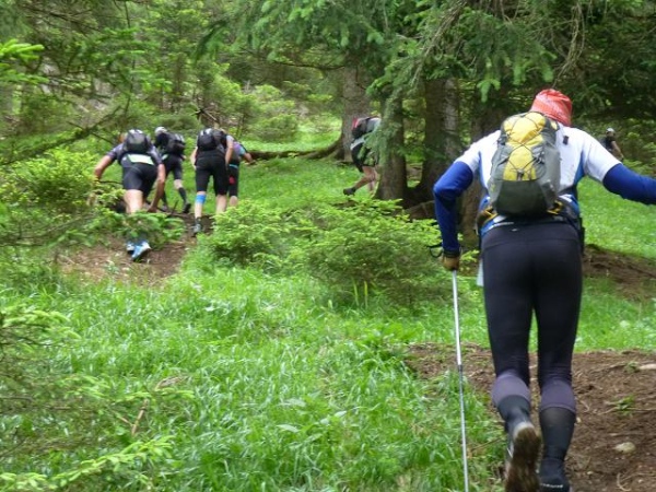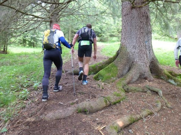 Auf einem schmalen, steinigen Pfad, der schließlich in einen breiten Forstweg mündet, geht es in stetigem Auf und Ab weiter durch den morgenkühlen feuchten Wald. Die ersten 450 Höhenmeter sind geschafft, als wir bei km 10,5 am Abzweig zum Eibsee die erste von zehn Verpflegungsstellen entlang der Strecke erreichen. Wasser ist allerdings das Einzige, was hier im Angebot steht. Aber mehr brauchen wir noch nicht.