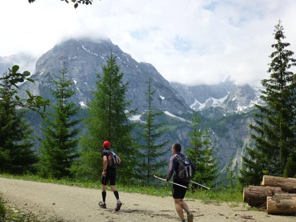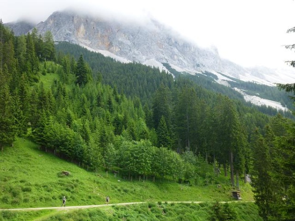 Die Bodenbeschaffenheit unseres Weges ändert sich immer wieder. Mal schmaler, steiniger Single-Trail, dann wieder bequemer breiter Forstweg. Und in zunehmendem Maße: weicher Wiesenpfad. Lange, saftig grüne Wiesenbänder, bisweilen leider auch bis auf den steinigen Untergrund erodiert, durchbrechen das Dickicht des Waldes. Unschwer erkennbar ist: Hier tobt sich im Winter der Alpinsport aus. Jetzt, im Sommer, sind die Pisten verwaist und bieten zumindest den einsamen Wanderern und heute auch uns eine luftige Panoramatrasse durch die Berglandschaft. Das Wettersteinmassiv vor Augen geht es zumeist bergan. Mehr und mehr wabern Wolken heran und machen sich daran, den Fels zu verschlucken.