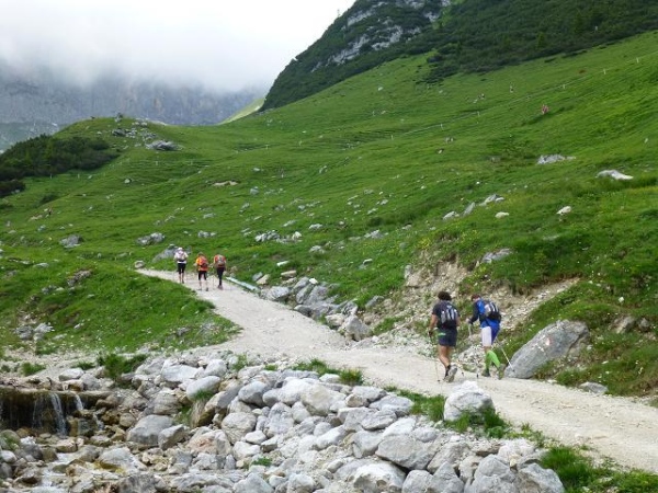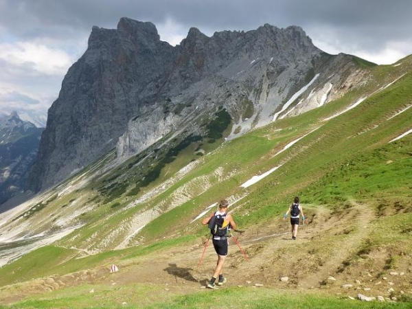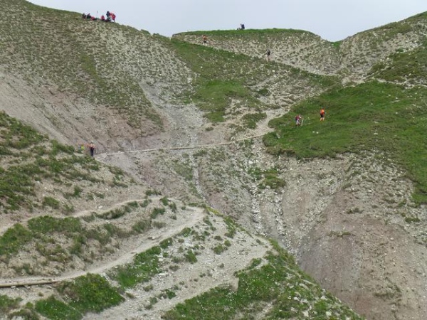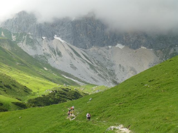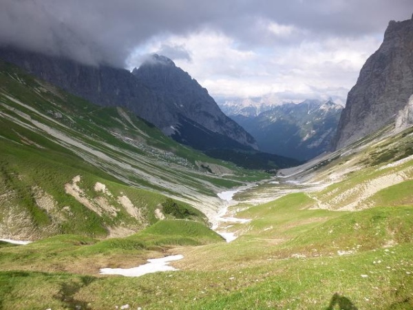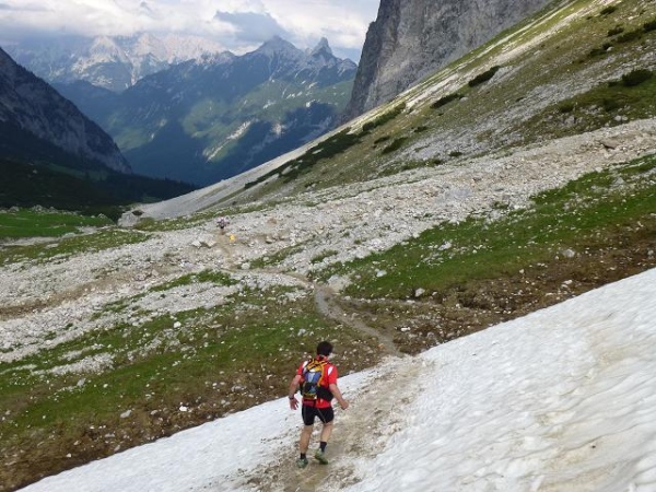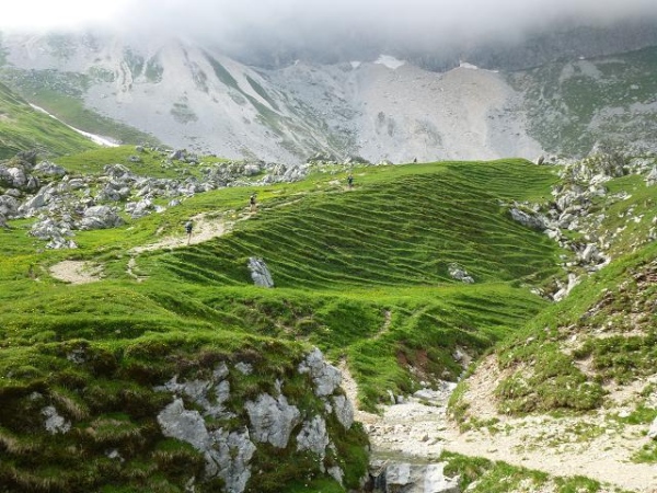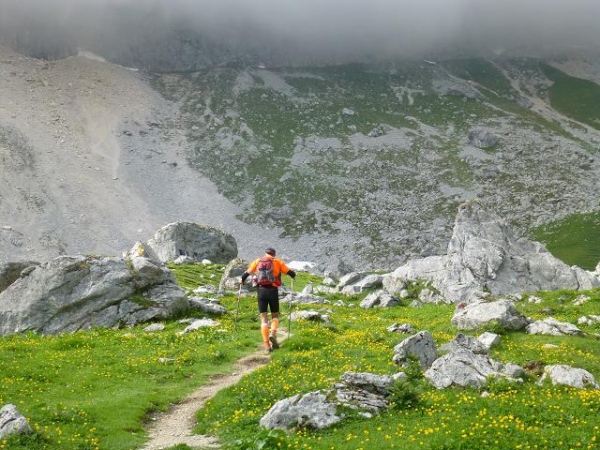 Ich merke, wie mir die Luft ausgeht und immer wieder muss ich innehalten. Zumindest habe ich so Gelegenheit mich mehr auf das alpine Panorama einzulassen. Und das ist einmal mehr wundervoll: Oberhalb der schroffen Felswände türmen sich fast schon bedrohlich dunkle Wolken. Geröllhalden und Schneefelder ruhen auch hier im Übergang vom Fels zum sattgrünen, teils in Terrassen gefalteten Bodenflor. Große Findlinge erinnern daran, dass hier einst Gletscher entlang zogen. Die immer wieder kräftig durchbrechende Nachmittagssonne intensiviert die Farben und Kontraste und macht die Szenerie noch eindrücklicher. Langsam ziehe ich durch diese urtümliche Landschaft und lasse mich von einem nach dem anderen Läufer überholen.