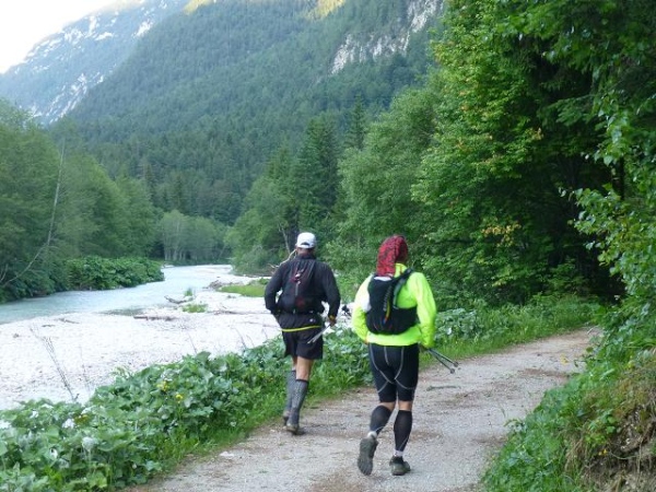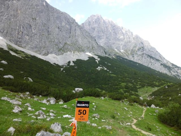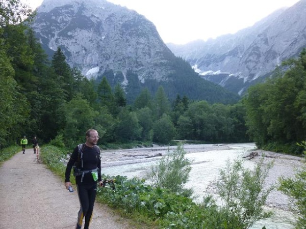 Der fortgeschrittene Tag ist deutlich zu spüren, als ich mich um 19:45, gerade einmal 1,5 Stunden vor dem Zeitlimit, wieder der Einsamkeit des Langstreckenläufers aussetze. Motivierend ist immerhin, dass die noch anstehenden 2.000 Höhenmeter auf den verbleibenden 44 km zunächst einmal auf sich warten lassen. Denn unser Kurs folgt nun fast bretteben dem Radweg entlang der Leutascher Ache, die durch das breite gleichnamige Tal rauscht. Wer in den Bergen entspannt richtig laufen will, der hat nun dazu die Gelegenheit. Vorausgesetzt er ist dazu noch in der Lage. Und das ist bei mir nur bedingt der Fall.