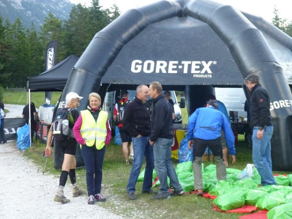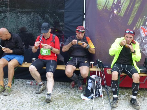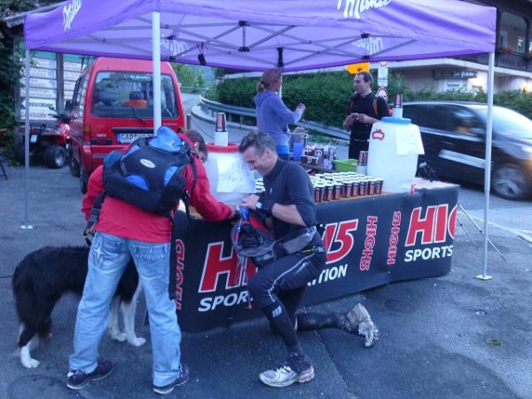 So plötzlich, wie ich in den Wald geraten bin, so plötzlich bin ich bei km 56 wieder draußen. Und vor meinen Augen erscheint der von mir schon sehnlichst erwartete Versorgungspunkt am Hubertushof Reindlau (1.085 m üNN). Mit seinen diversen Zelten und Pavillons ist er der größte seiner Art. Und bevor man hier an den Futtertrog gelassen wird, muss man sich erst den gestrengen Augen eines Arztes stellen, der jeden Ankömmling in einem eigenen Durchlaufzelt abpasst. Aber dann ist der Weg frei: Suppiges scharfes Chili con Carne steht auf dem Speiseplan, nicht wirklich ein Genuss, aber doch das Richtige. Ein Hochgenuss sind dafür die kühlen, süßen Wassermelonen. Mit Käse, Salami, Tomaten, Brot und Kuchen runde ich mein persönliches Menü ab. Eigentlich hatte ich ja gehofft, mich in einen der Klappliegestühle flezen zu können, die im Vorjahr so gut angekommen waren. Aber leider stehen heuer nur profane Biertischgarnituren bereit. Wer Wechselkleidung am Start abgegeben hat, der kann sie sich hier abholen. Und wer gar keine Lust mehr auf Weiterlaufen hat, für den steht ein Shuttle zum Ziel bereit. Beides ist für mich kein Thema, auch wenn mir meine Beine sagen, dass sie eigentlich heute schon genug ertragen haben.