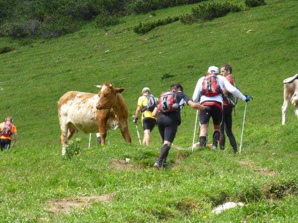 Die Wangalm (1.755 m üNN) bei km 46,6 markiert die Halbzeit des Aufstiegs und gleichzeitig den Wiedereintritt in hochalpine Regionen. Die hier friedlich grasenden Kühe lassen sich durch die zwischen ihnen dahin tröpfelnden Läufer nicht im mindesten beeindrucken. Nun ja: Die Dynamik, die wir beim Ansteig verströmen, passt auch ganz gut zur Lethargie der Wiederkäuer.