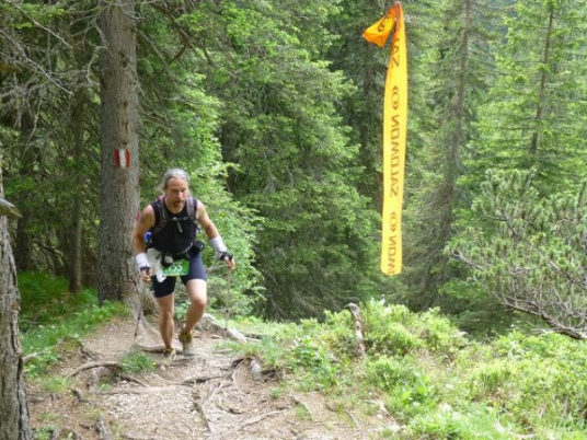 Als ich nach einer finalen Geröllpassage um 17:45 Uhr bei km 48 km schließlich den Grat des Scharnitzjochs (2048 m üNN) erreiche, bin ich fix und fertig. Lauffreund Bernie erwartet mich bereits mit aufmunternden Worten, doch hier muss ich ihn dann endgültig ziehen lassen. Ich gönne mir eine längere Pause und gerade in der Nachschau sind es die Pausen an solch exponierten Stellen, die am eindrücklichsten in Erinnerung bleiben und das Bild dieses Trails prägen.