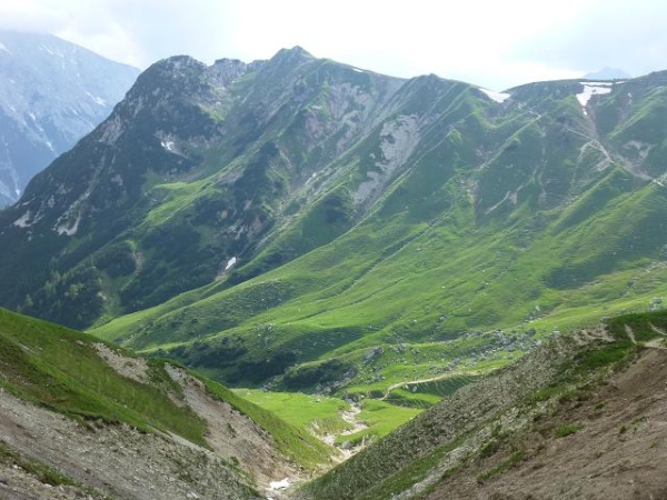 Auch jenseits des Jochs setzt sich die grandiose Bergszenerie fort. Den von hier ins Tal führenden Pfad kann ich bis zu dem Punkt verfolgen, wo er sich in der Einsamkeit des Horizonts verliert. 960 Höhenmeter abwärts stehen auf den nächsten 8 km an. Der Teil des Weges, den ich von oben überblicken kann, wirkt dabei gar nicht so dramatisch. Dass es dieser Weg aber in sich hat, darf ich schnell feststellen, als ich mich endlich zum Weiterlaufen aufraffe. Es ist gar nicht mal das Gefälle und auch nicht der holprig-steinige Untergrund, aber die immer wieder zu kreuzenden Schneefelder und durch überlaufende Bergbäche geschaffenen matschtriefenden Sumpfpassagen erlauben nur ein vorsichtiges Trippeln. Nach einer gefühlten kleinen Ewigkeit läuft das Tal in weiten, weichen Wiesen aus. Unvermittelt taucht der Pfad in dichtes Walddickicht und stürzt sich nun förmlich in die Tiefe.