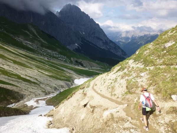 Kaum 2 km begleiten wir die Ache, dann entfernt sich der Weg vom Wasser und führt am Waldesrand mit Blick über endlos weite Wiesen weiter. Gänzlich ungewohnt müssen wir schließlich gar ein Stück einer (geringfügig) autobefahrenen Asphaltstraße folgen, ehe wir bei km 62 den Zugang zum Erlebnispark der Leutascher Geisterklamm passieren und oberhalb der Klamm trailgerecht wieder auf einem Naturweg durch den Wald weiterlaufen dürfen. Ein einfaches Schild informiert über den sonst unmerklichen Übergang zurück auf deutschen Boden. Über den Baumkronen sehe ich im letzten Sonnenlicht die sich senkrecht auftürmenden, schroffen Felswände der Nördlichen Karwendelkette erstrahlen. Sie zeigen, dass ich im Moment dem Karwendel- näher als dem Wettersteingebirge bin. Für Klettersteigfreunde auch hier eine Empfehlung: Den „Mittenwalder Höhenweg“, der in luftiger Höhe mit herrlichem 360 Grad-Panoramablick über den Gipfelgrat der Nördlichen Karwendelkette führt.