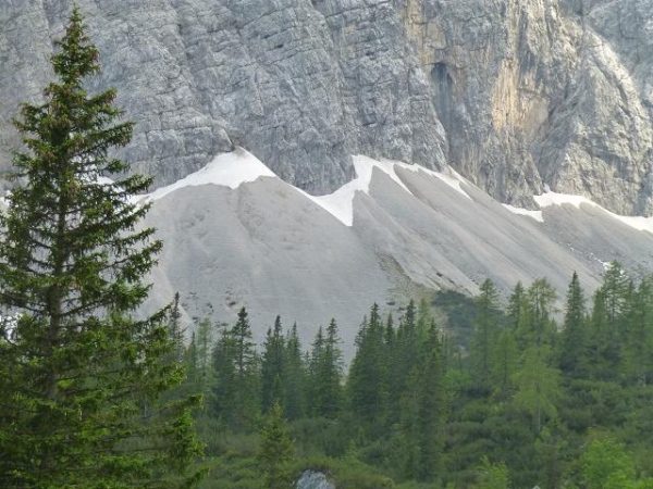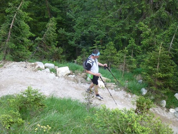 Die nächsten 630 auf 6 km verteilten Höhenmeter hinauf zum Scharnitzjoch liegen vor uns. Anders als auf dem Weg zum Feldernjöchl ist unser fernes Ziel zunächst noch dem Blick verborgen. Auf einer Forststraße geht es eingangs recht bequem durch das Nadelgehölz, ehe sich der Weg über einen wurzeligen Pfad weiter empor windet. Erneut fordert dies die volle Konzentration und Kraft. Vor allem Letztere merke ich zunehmend schwinden.