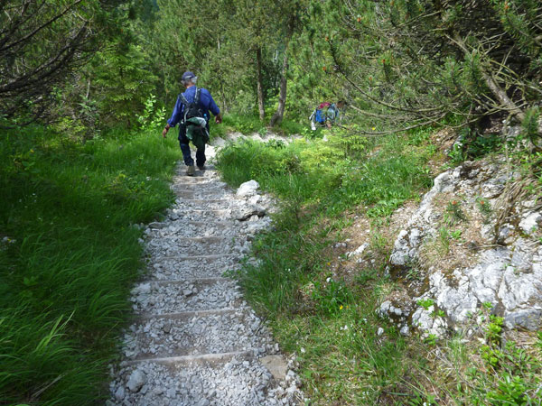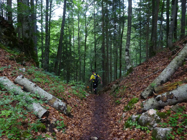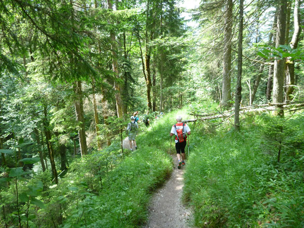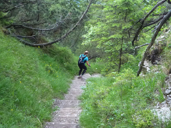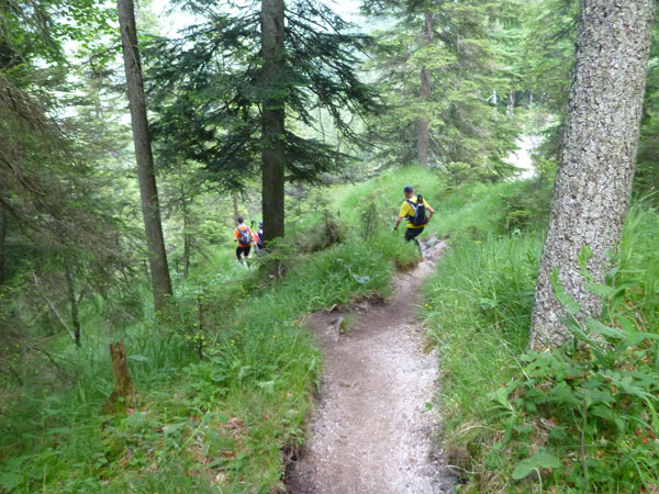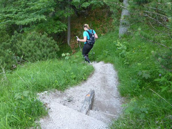 Nach mehr als 5 Kilometern dürfen wir endlich wieder in die Pampa und auf schmalen Pfaden verschwinden. Der Kälbersteig durch den märchenhaften Ebenwald ist ein Traum. Der über einen Kilometer lange Abstieg ist aber auch schwer und nicht ungefährlich zu bewältigen. Hohe Stufen und extrem wurzelige Passagen an meist steil abfallenden Hängen strapazieren die Oberschenkel. Aber genau das ist ja auch die Abwechslung, die wir am Trailrunning so lieben.