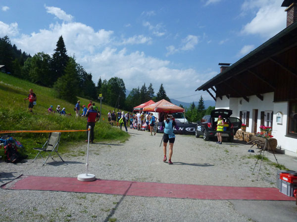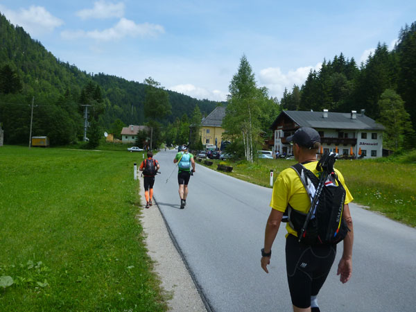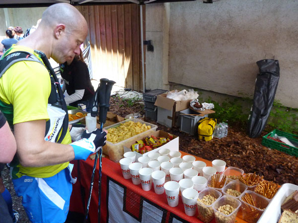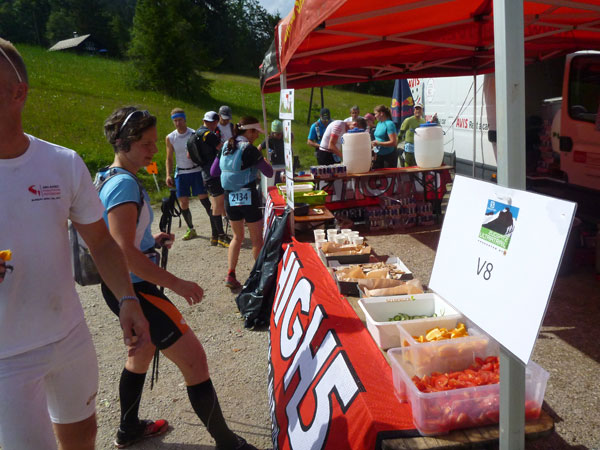 Wir haben hier ziemlich genau 30 km hinter uns und der Cut-Off liegt bei 6:45 Std. Mario und ich haben 1:30 Std. Zeitguthaben, so gibt es keinen Grund für Hektik, wir können uns etwas Zeit nehmen. Die Stelle hier ist im Übrigen hervorragend geeignet, um die Sonnwendfeuer zu beobachten, die heute Nacht ringsum auf den Bergen entzündet werden. Oft sind da richtig glühende Kunstwerke darunter.