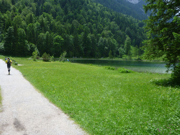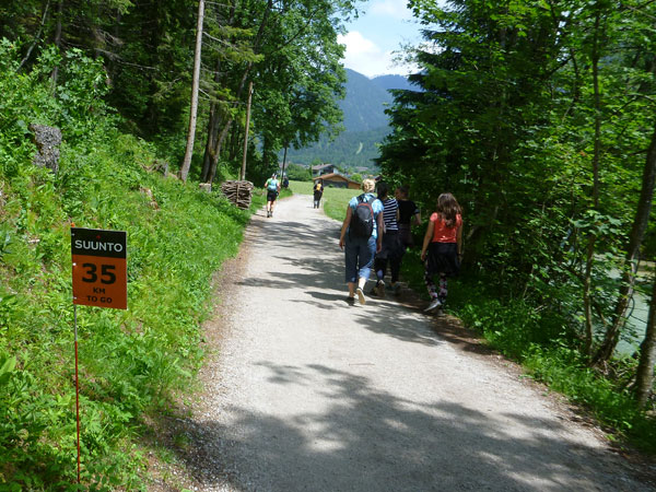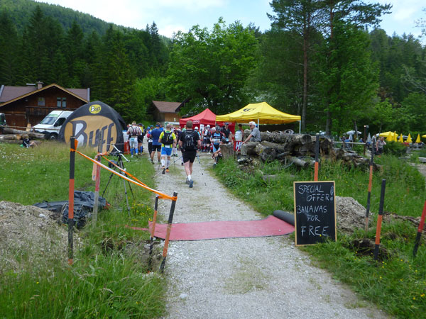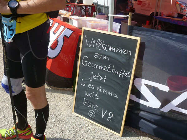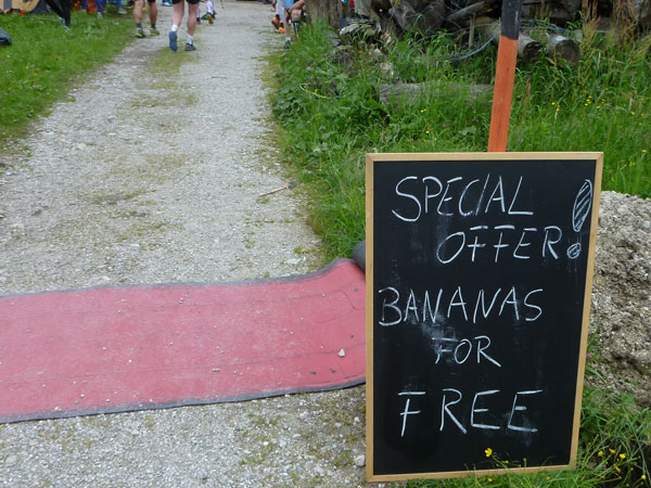Nach halber Umrundung des Ferchensees ist wieder Verpflegen angesagt. Der Name kommt von den Ferchen, womit Forellen gemeint sind. Die tummeln sich auch heute noch im idyllischen und glasklaren Bergsee, der der höchstgelegene unter den vielen kleinen Seen hier in der Gegend ist. Direkt neben dem Gasthaus mit Biergarten ist V7 errichtet. Forellen stehen aber nicht für uns im Angebot, dafür „Bananas for free“ wie uns die Schiefertafel vor der Station verkündet. Aber keine Angst, so spartanisch wie bei manchem City Marathon geht es auf Ultratrails nicht zu. Das Angebot an allen Labestellen ist reichlich und auch vielfältig.