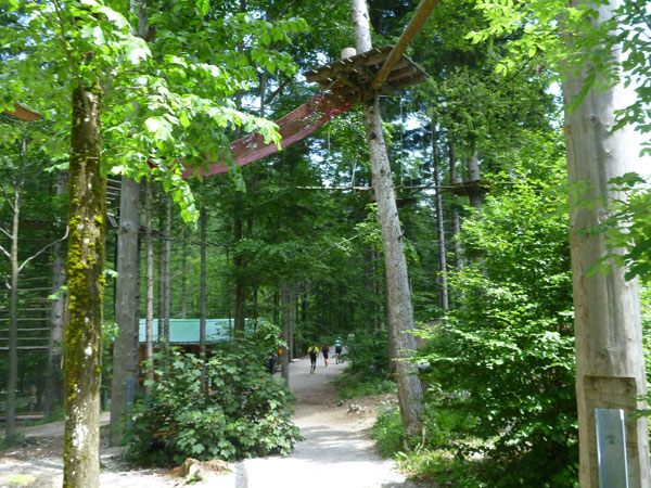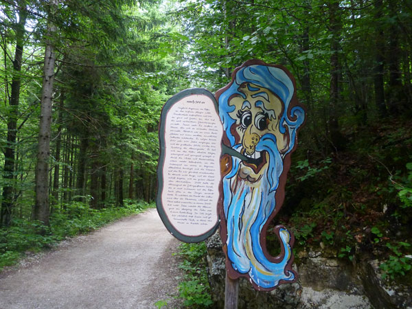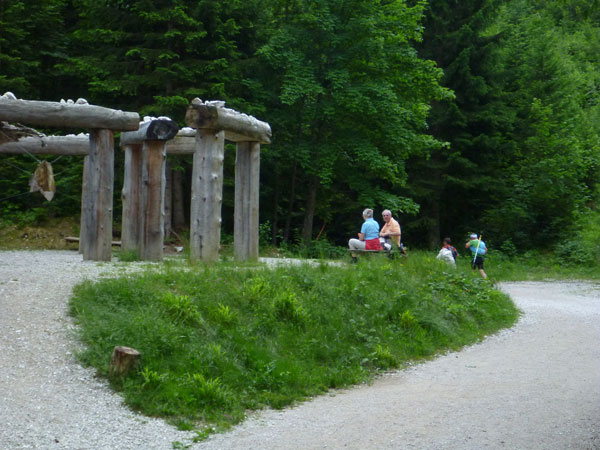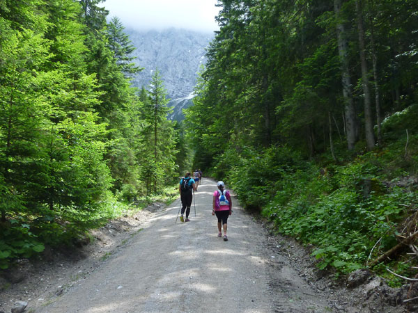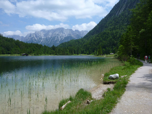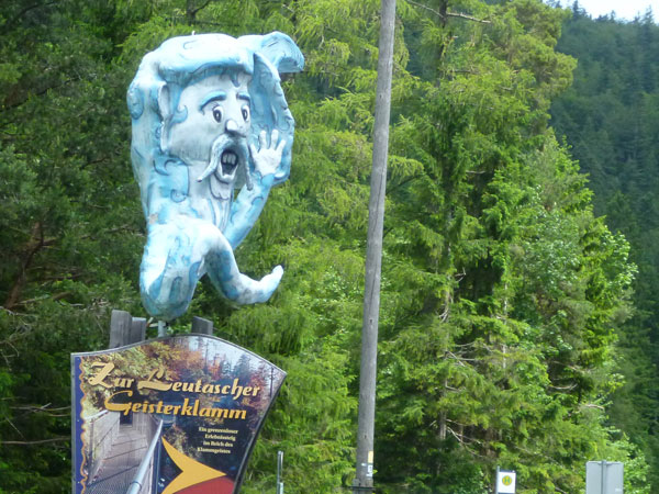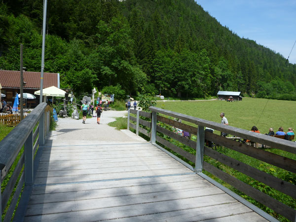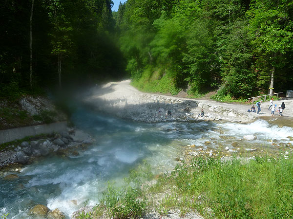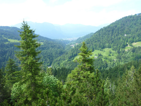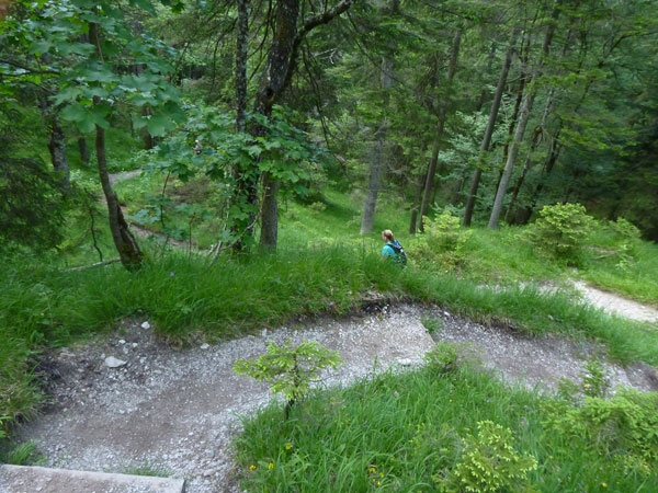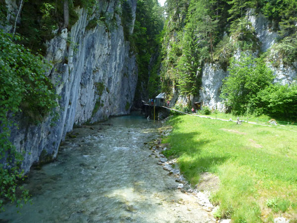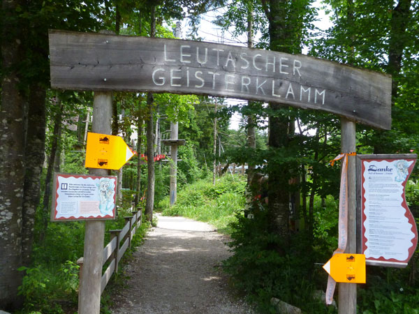 Rechts geht es ab über den Parkplatz in die Klamm. Die Leutaschklamm selbst ist die derzeit längste erschlossene Klamm in den deutschen Alpen. Ein Großteil ist seit 2006 auf modernen Metallstegen in luftiger Höhe begehbar, wir werden aber nur auf den Weg durch die Geisterklamm geschickt, der zwar besser zum Laufen geeignet ist, dafür aber auch recht unspektakulär ist. Breite Wanderwege mit einem deftigen Schlussabstieg führen uns so ans andere Ende.