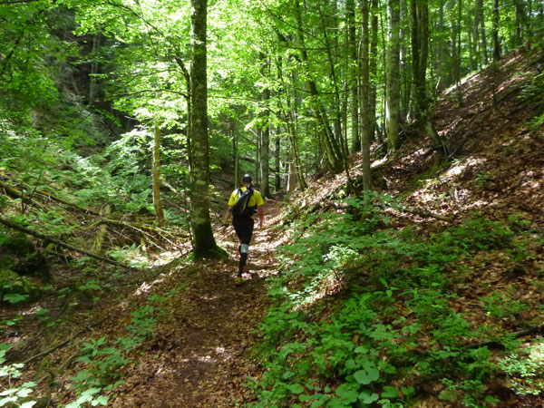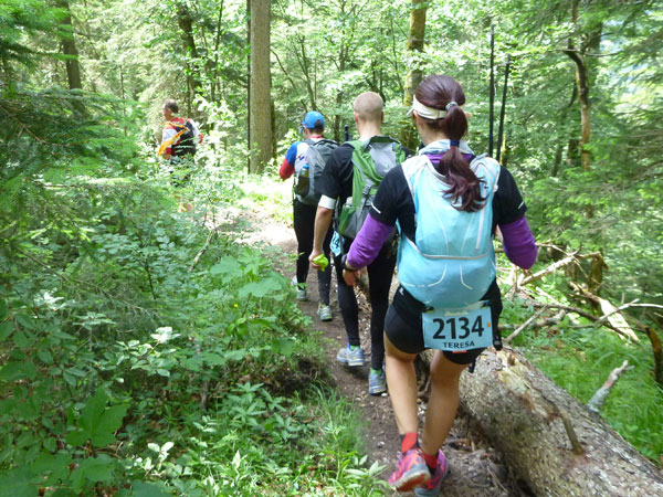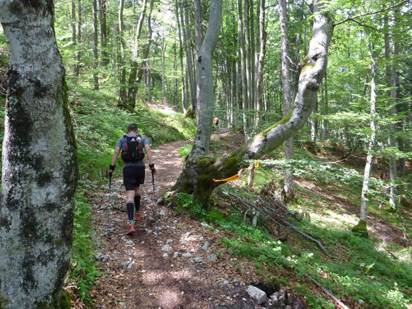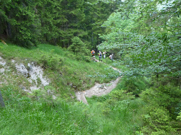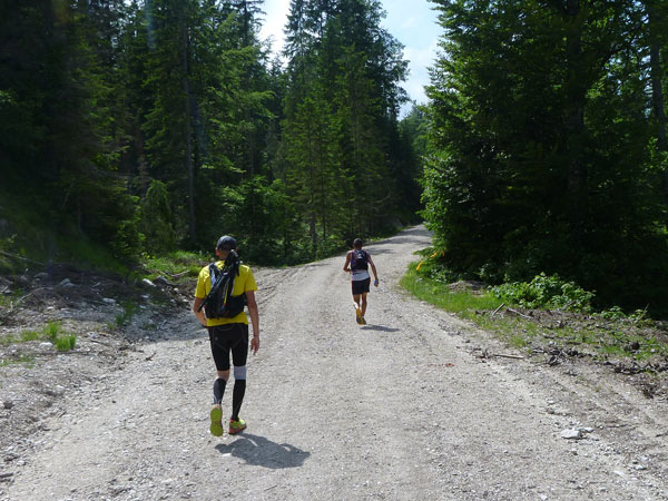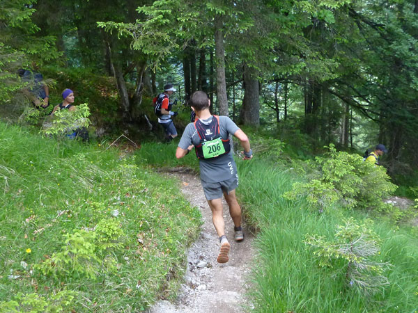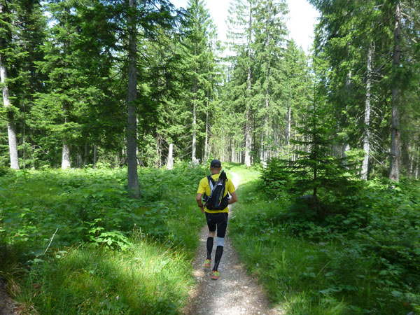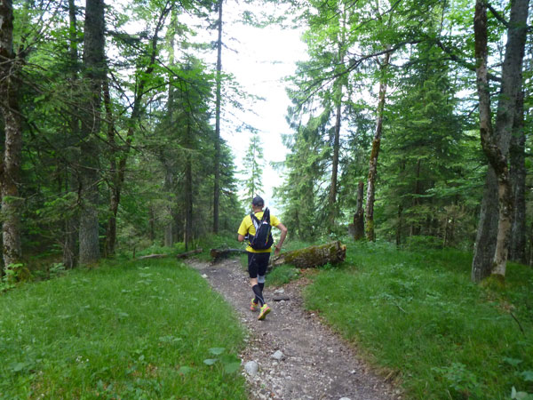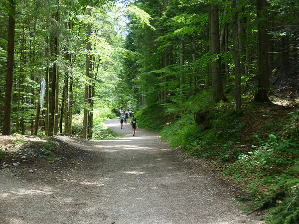 Gefühlt 5 km kerzengerade und meist mit leichten bis mittelschweren Anstieg zieht sich der breite Bannholzweg durch den Wettersteinwald. Hier immer im Laufschritt unterwegs zu sein, ist verdammt hart, so sind wir meist abwechselnd marschierend und laufend unterwegs. Immer öfter werden wir von schnellen Supertrail XL-Teilnehmern und wahrscheinlich auch von den ersten Ultratrailern überholt. Selbst sie nehmen an stärkeren Steigungen Tempo raus und marschieren bestimmte Abschnitte, der Unterschied zu uns: Sie können das etwas schneller. Wann uns der Führende des Ultratrail überholt hat und ob der vielleicht auch mal in Speedhiking verfällt, konnte ich leider nicht ausmachen. Ich finde es immer sehr interessant die Spitzenleute während des Rennens aus nächster Nähe zu sehen.
