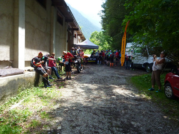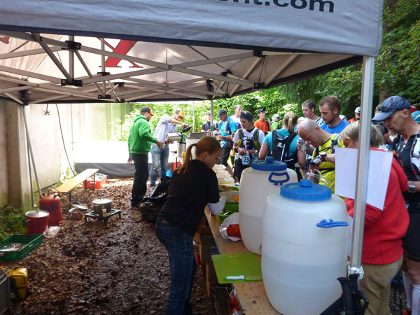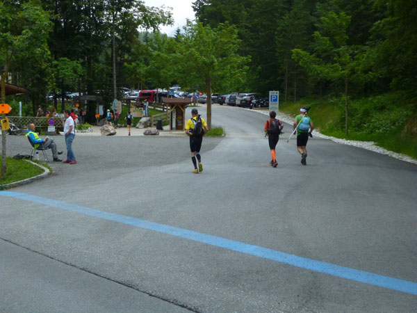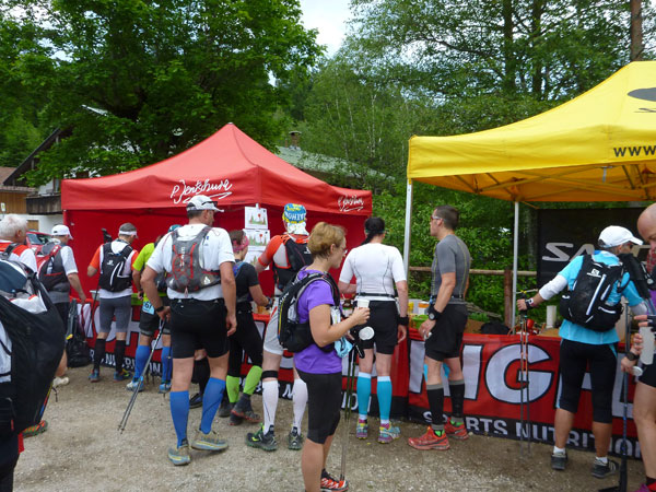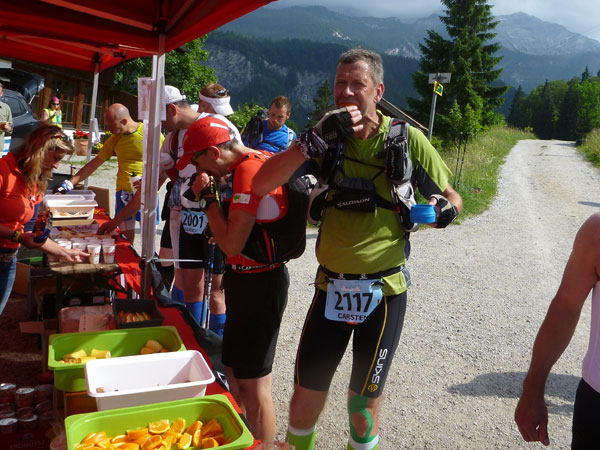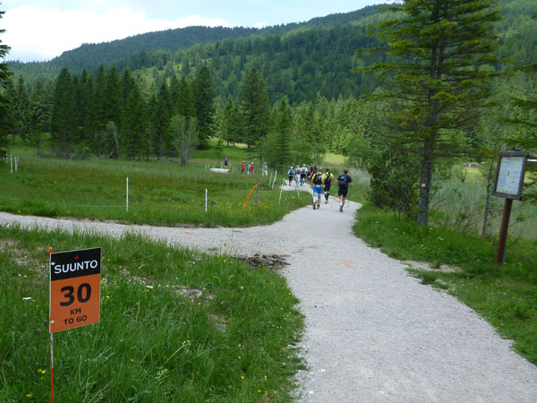 Am Ferchenbach erreichen wir das Tal, vielleicht hundert Meter weiter ist der Zusammenschluss mit der Partnach, wo bei den vergangenen Austragungen vor der Brücke immer eine Labestelle postiert war. Die kurzfristige Streckenänderung befördert uns ansatzlos wieder nach oben. Erst etwa einen halben Kilometer weiter können wir uns an der Labe V8 (Km 40) vor der Partnachalm verpflegen. Somit entfällt heuer die Durchquerung der Partnachklamm über den Eisernen Steg.