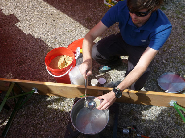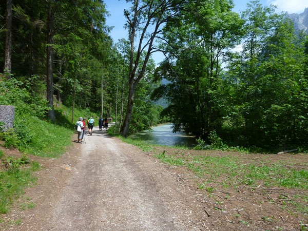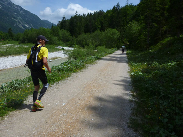 Nach Überqueren einer Staatsstraße führt die Strecke an der Leutascher Ache entlang. Hier sind keine nennenswerte Steigungen zu bewältigen, es kann durchweg gelaufen werden. Auf halben Weg zur Leutascher Klamm kommt uns Trailschnittchen Julia Böttger, Ultratrail-Siegerin 2011, mit dem Radl und Anfeuerungsglocken entgegen. Ihr Fuß ist dick bandagiert, vorgestern hat sie sich bei einem Trainingslauf leider verletzt.