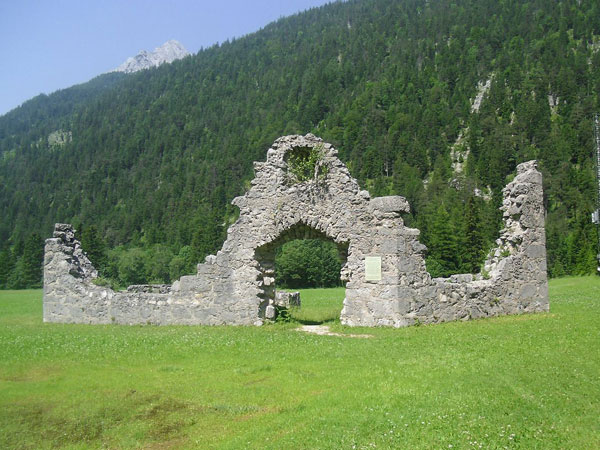 Kurz vor der Leutascher Geisterklamm gilt es noch etwa einen Kilometer am Seitenrand der Staatsstraße auf Asphalt zu absolvieren. Links von uns sind auf der Wiese noch die Reste der „Leutascher Schanz“ zu sehen, sie gehörte zur ehemaligen Befestigungsanlage Porta Claudia. Mehr dazu erzähle ich euch ein paar Kilometer weiter.