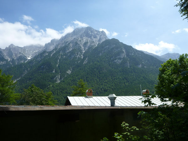 Ein kurzer Abschnitt an der Isar entlang lotst uns an den Ortsrand von Mittenwald. Nur am Rande tangieren wir den Ort. Ein Anstieg mit Straßenüberquerung – Vorsicht ist geboten, hier herrscht Autoverkehr – bringt uns zu V6 am Schützenhaus.